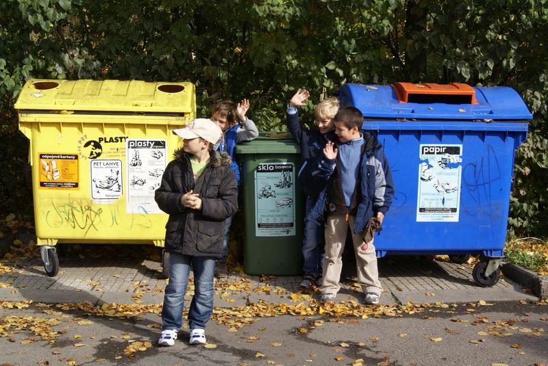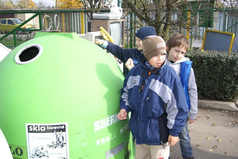 Cestou okolo barevných kontejnerů jsme si opakovali, kam patří papír (modrá), sklo (zelená), plast (žlutá) i zbytky jídla (hnědá popelnice). Ve běrném dvoru kluci dostali zajímavé omalovánky s ekologickými říkankami. Při další příležitosti je vykreslené zajdeme do sběrny odevzdat.