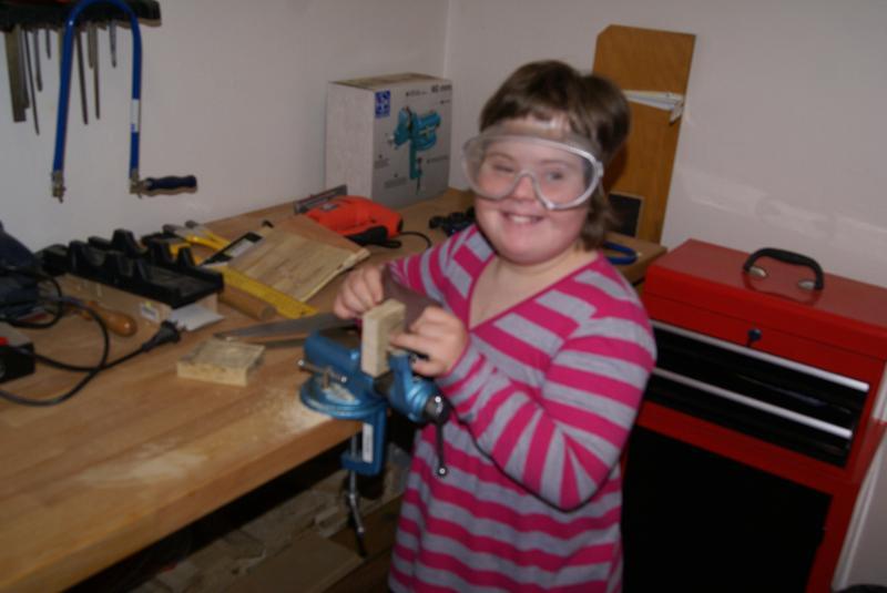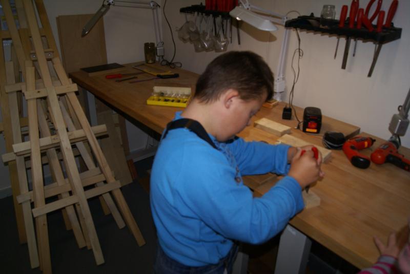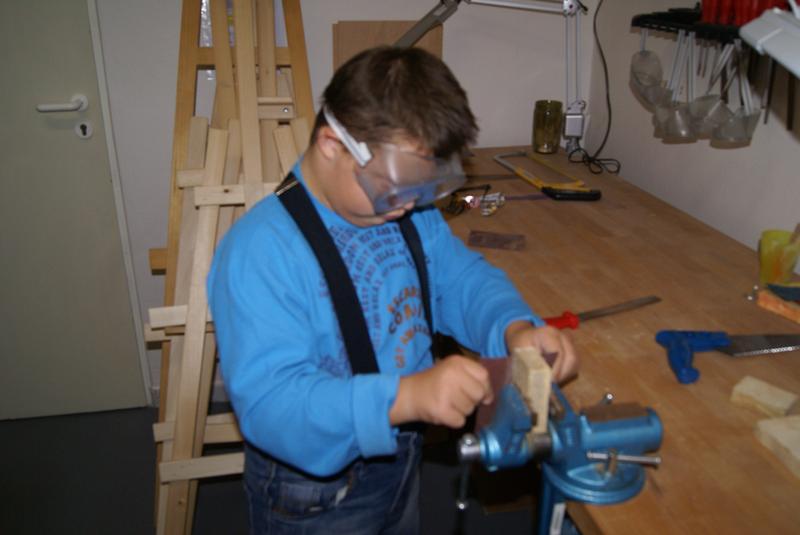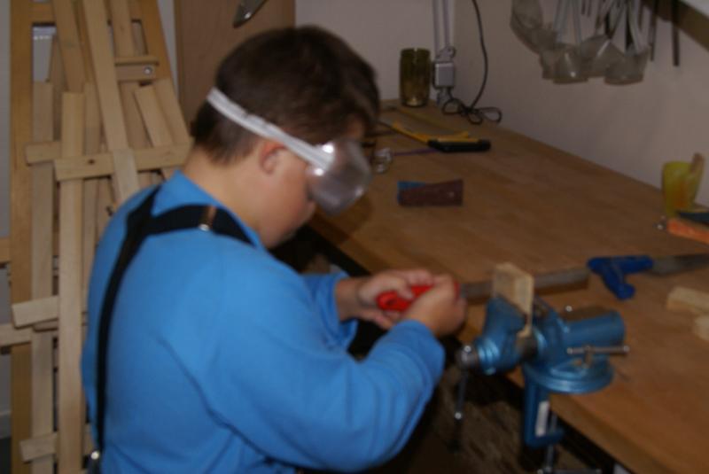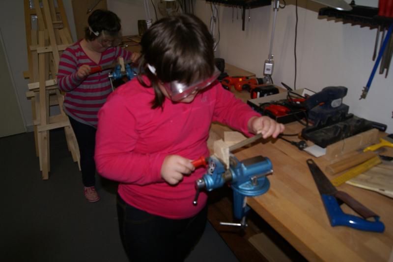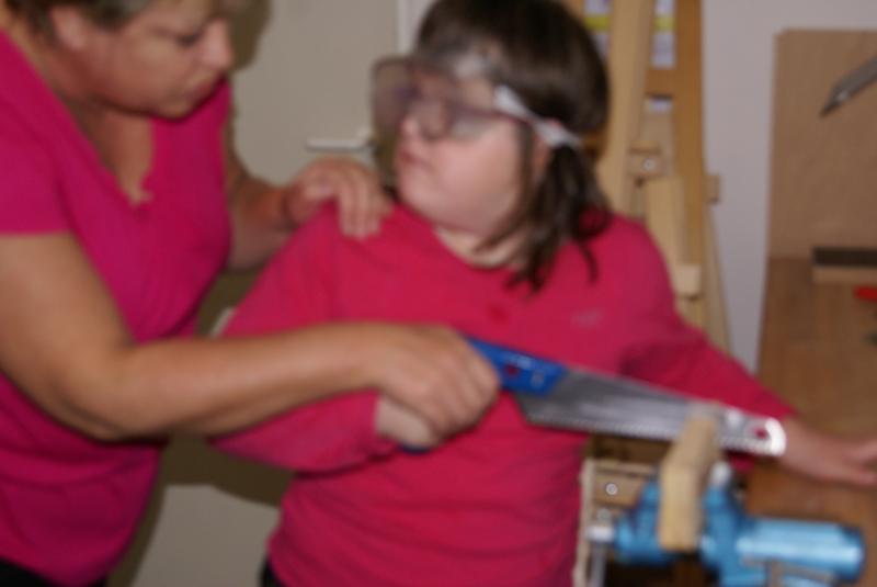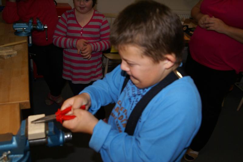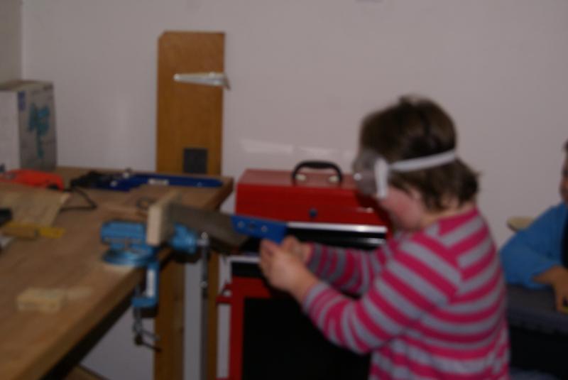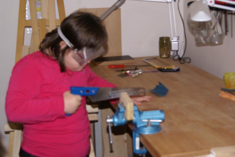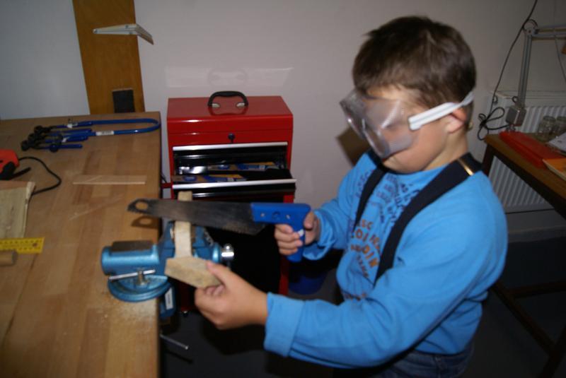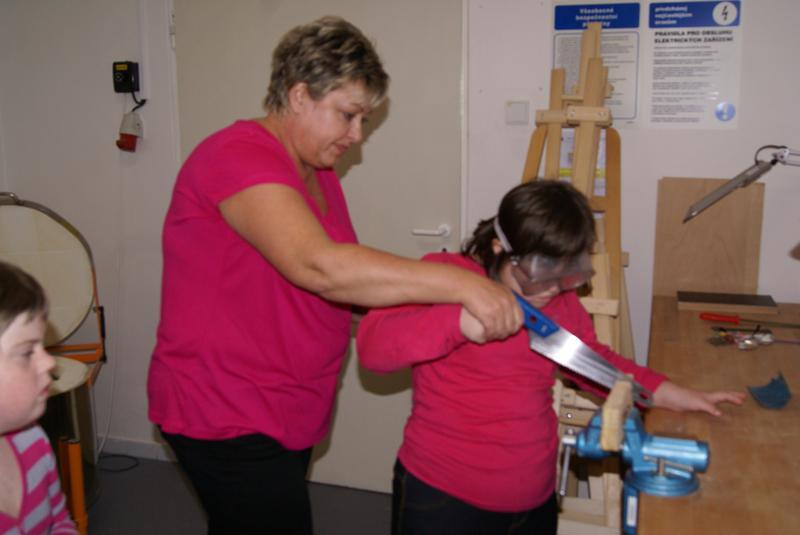 Věcné učení ve školní ergodílně. Práce se dřevem, pilka, pilník, kladivo a hřebík.