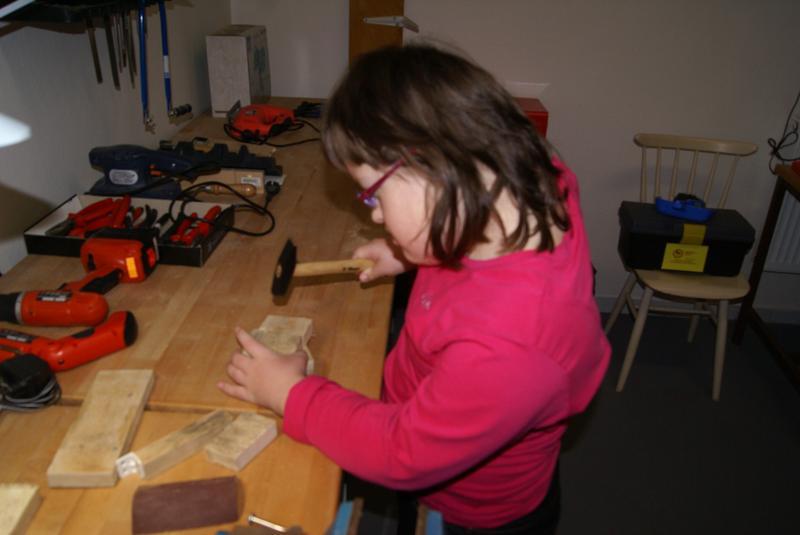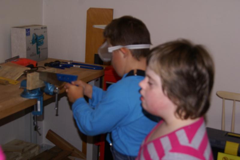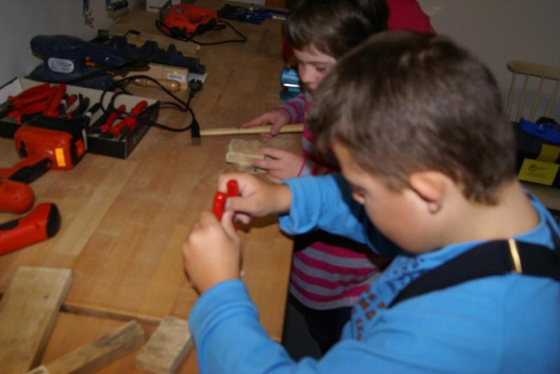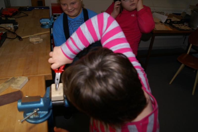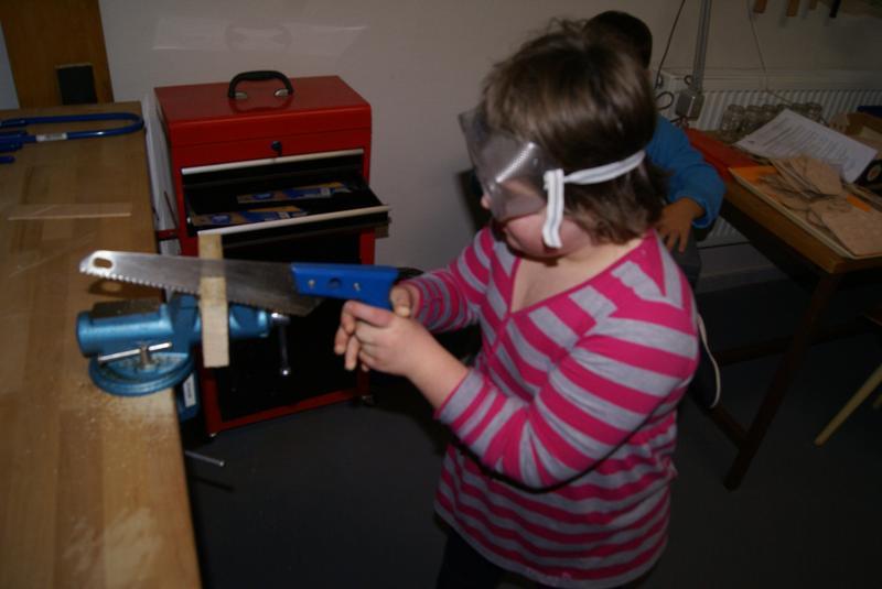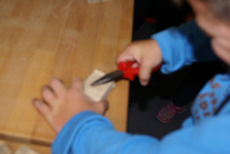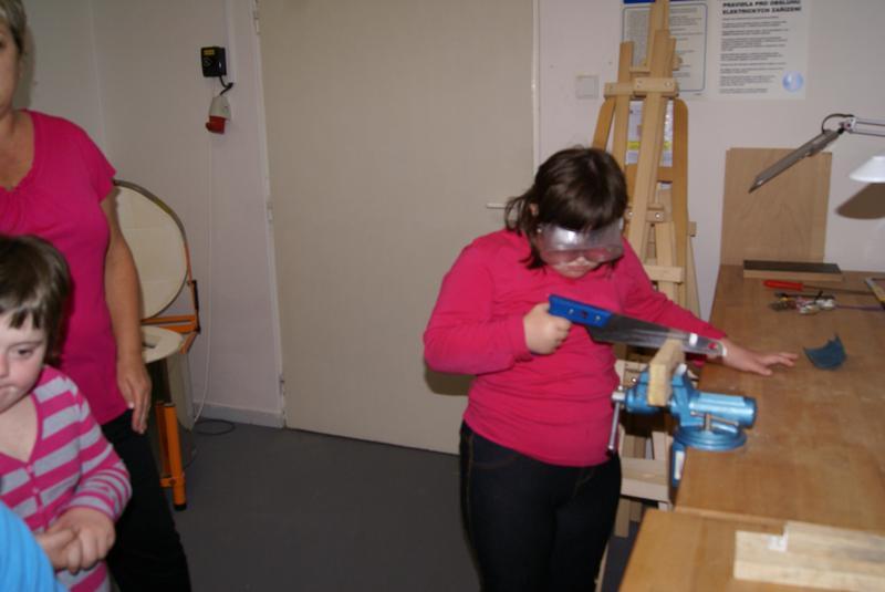 S velkým zájmem se děti seznámily s pravidly práce v ergodílně. Radostně si osvojovaly názvy pracovního nářadí a s ještě větší radostí s nářadím bezpečně pracovaly. Vyzkoušely si upínání materiálu do do svěráku, řezaly a zabrušovaly řezné pochy dřeva, zatloukaly hřebíky a spojovaly nařezané opracované kousky v jeden celek. Největší dřina byla s vytahováním špatně zatlučeného hřebíku. Při práci byly velmi šikovné!