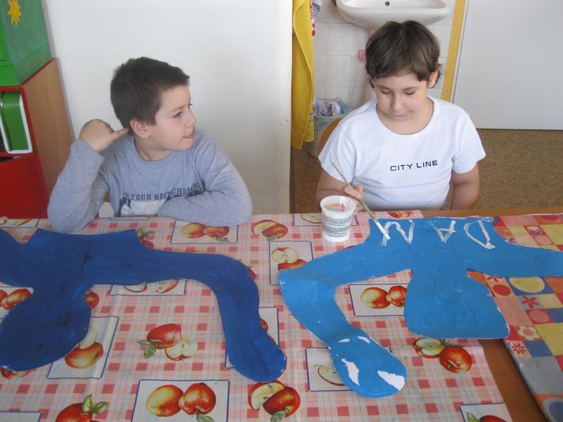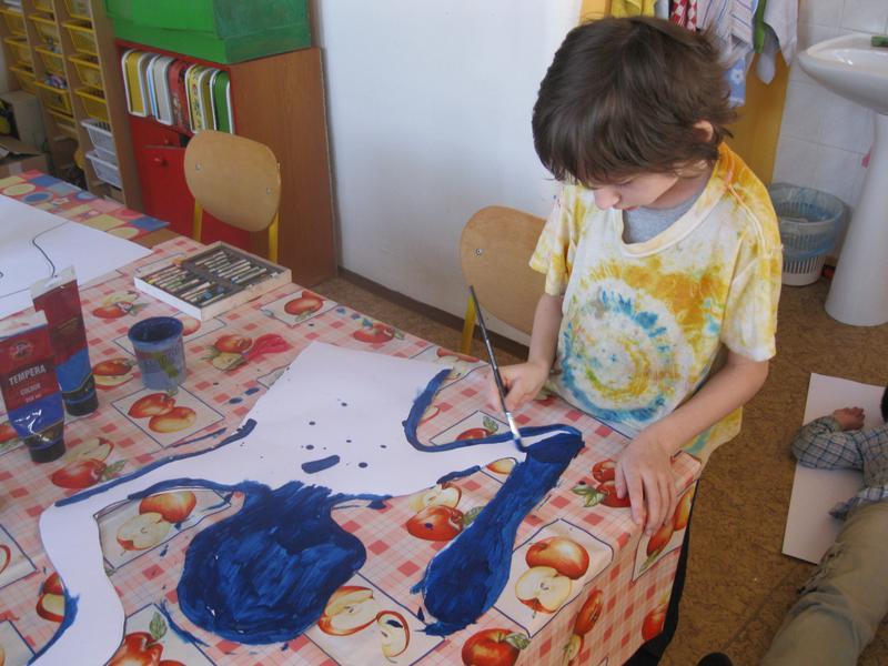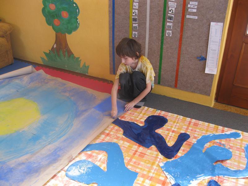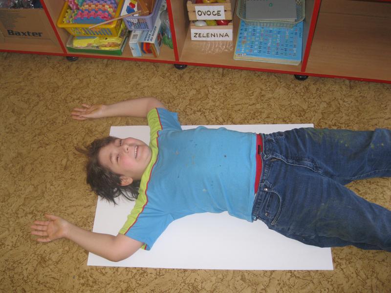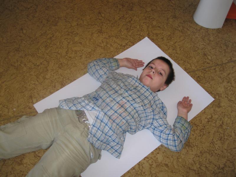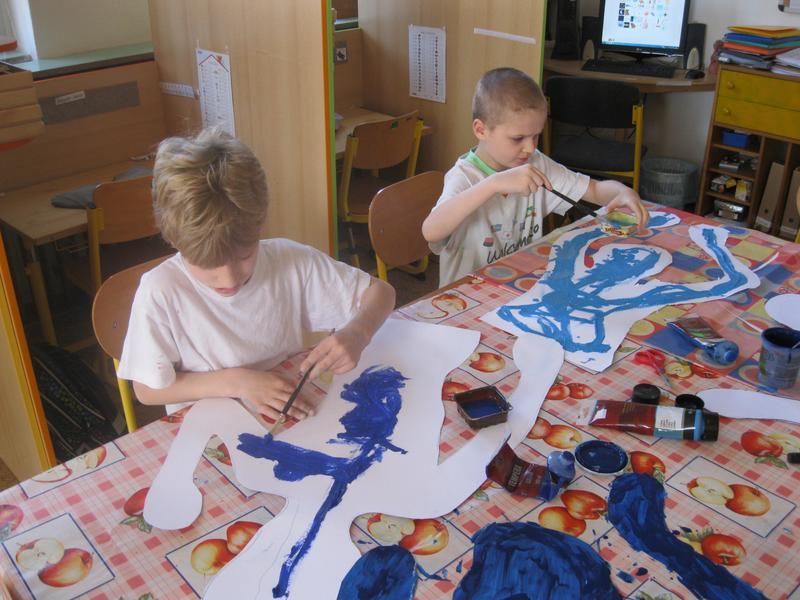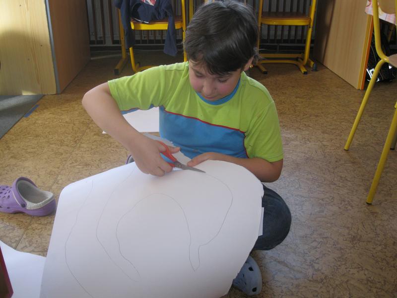 Každý z kluků se nechal obkreslit na velký papír, a pak jsme stříhali, barvili a lepili. Nakonec jsme plakát vyvěsili na budovu školy.