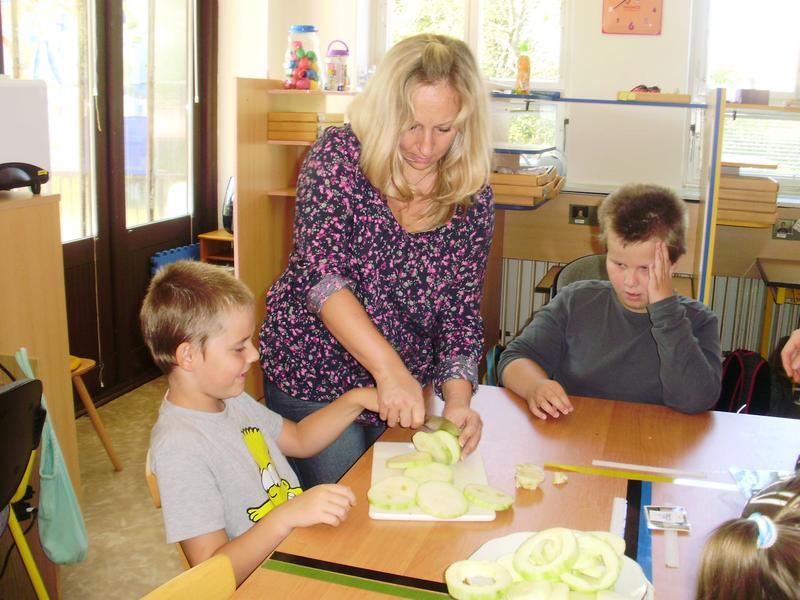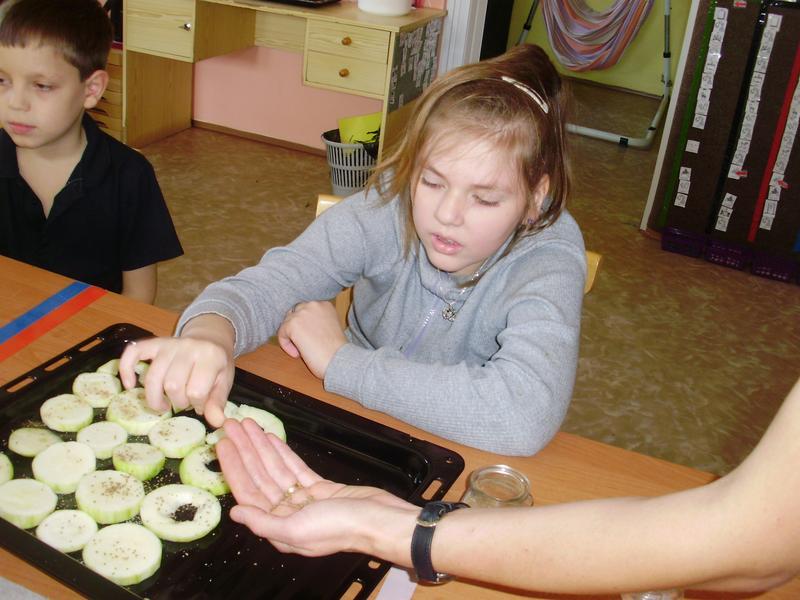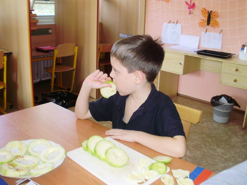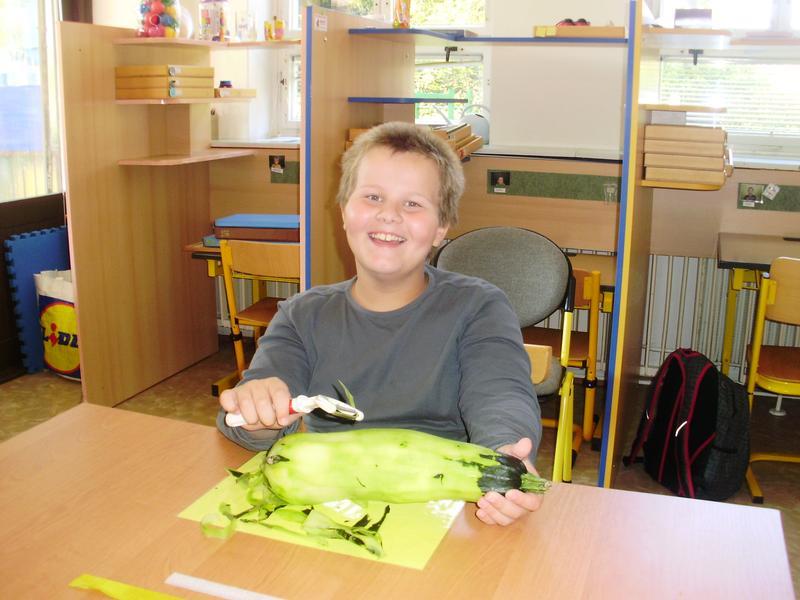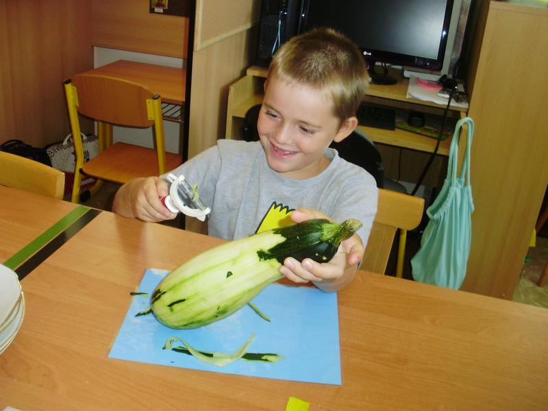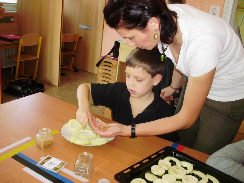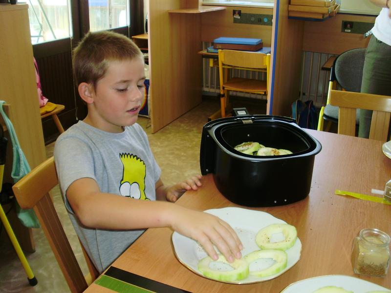 Dnes jsme začali a na jídelním lístku byla pečená cuketa. Do přípravy se všichni vrhli s nadšením. Umývali, škrábali, krájeli, sypali kořením... a čekali, až to bude.