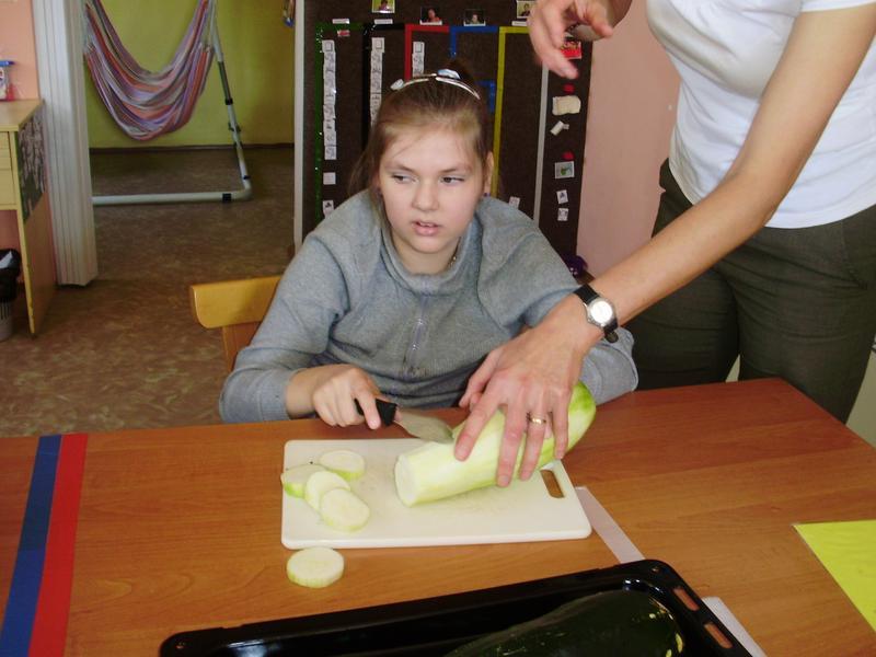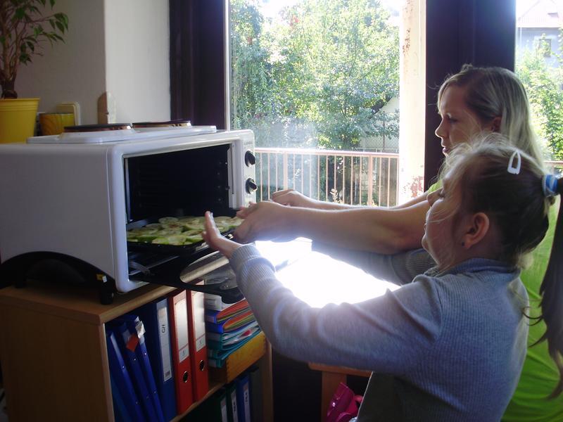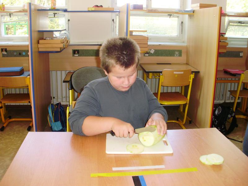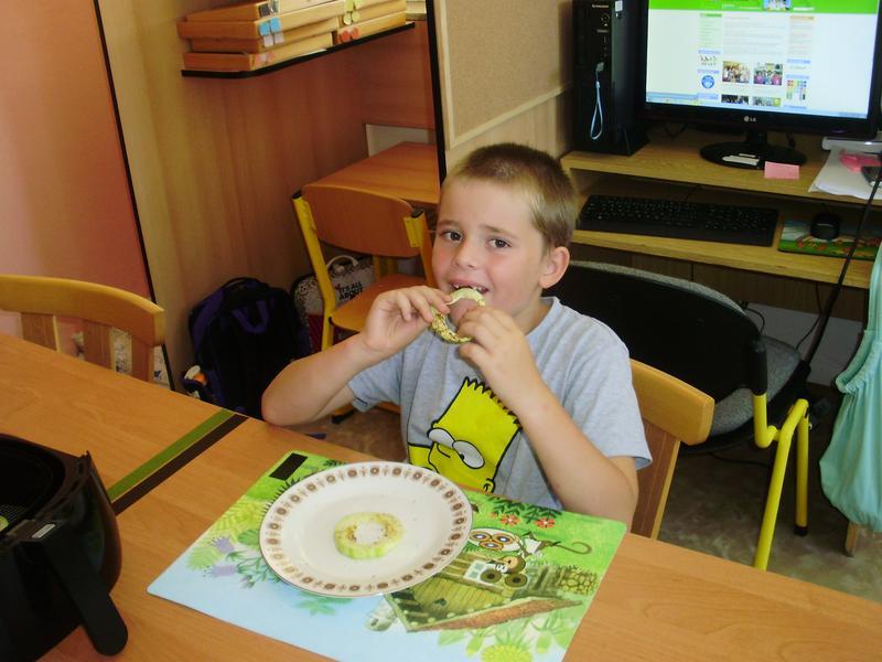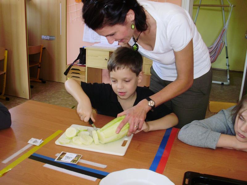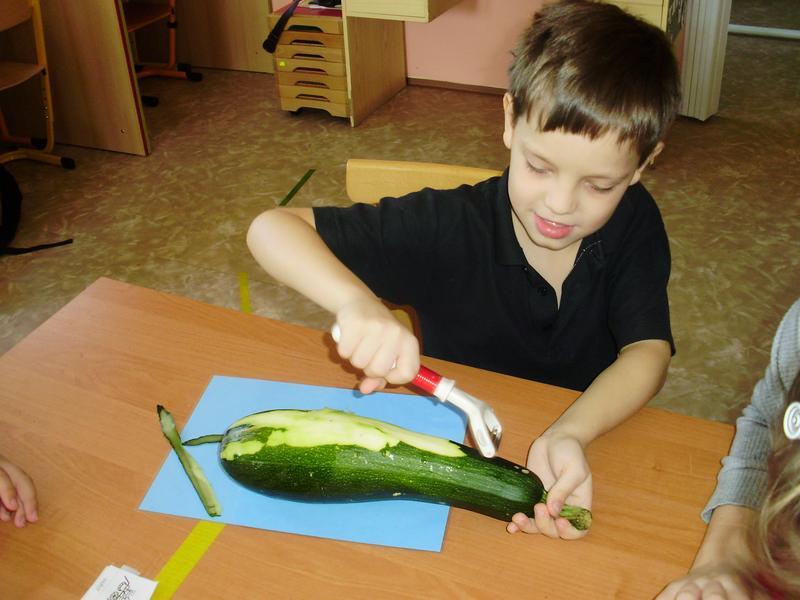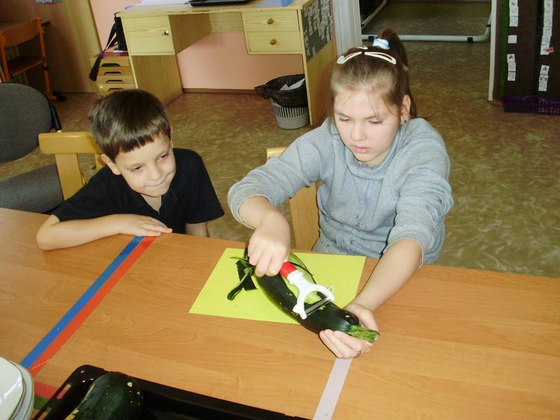 Dnes jsme začali a na jídelním lístku byla pečená cuketa. Do přípravy se všichni vrhli s nadšením. Umývali, škrábali, krájeli, sypali kořením... a čekali, až to bude.