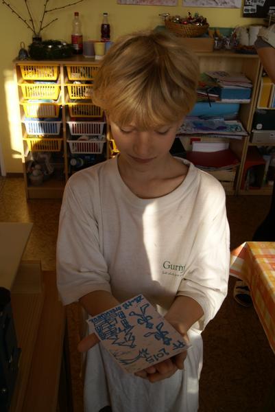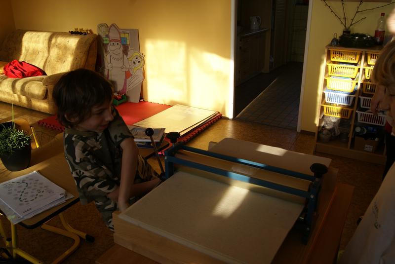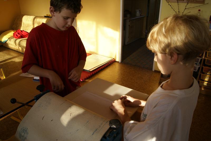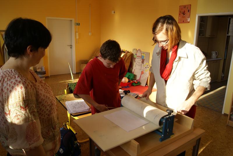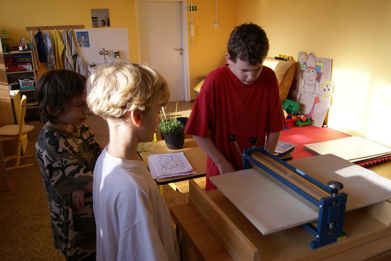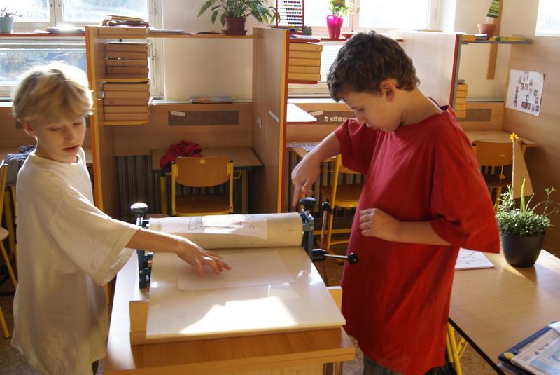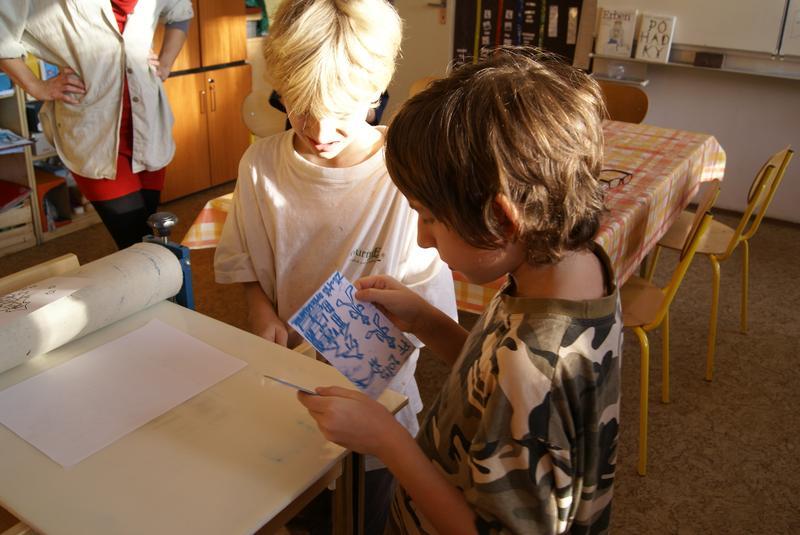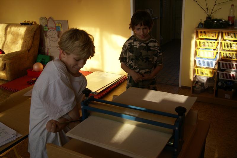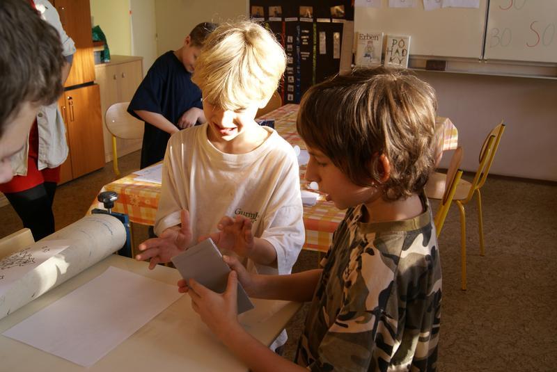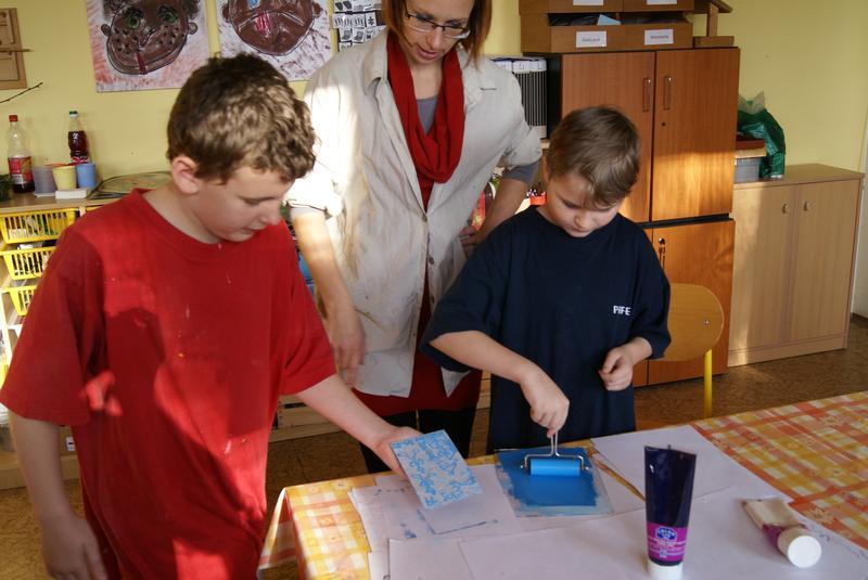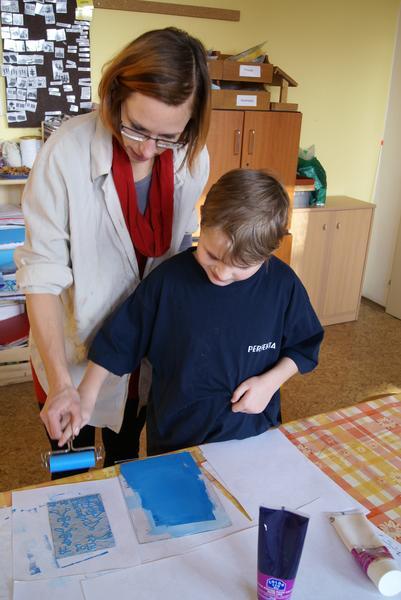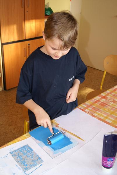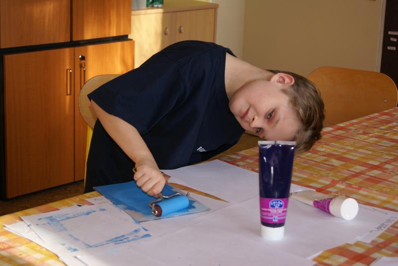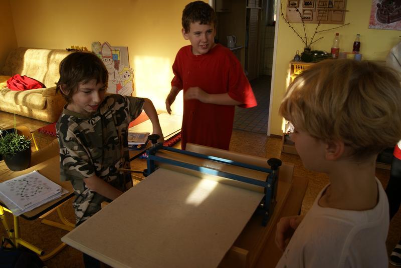 Práci si dobře zorganizovali a rozdělili mezi sebe. Vznikly tak čtyři pracovní pozice - nanášení barvy, příprava matrice k tisku, práce s lisem a vyjmutí přání.