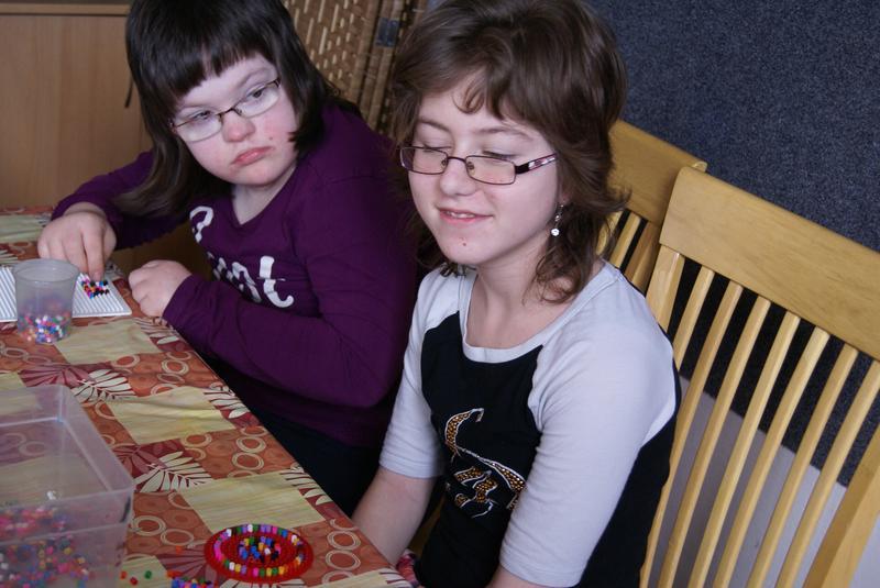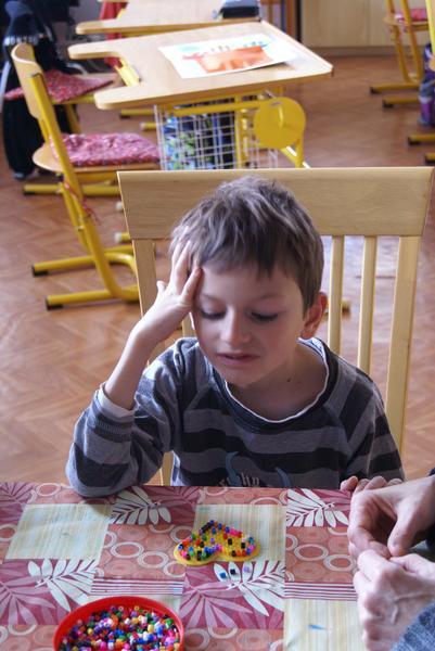 Chvíli povídání a her vystřídalo rozvíjení jemné motoriky a trpělivosti. Děti měly v pracovní výchově za úkol poskládat z velmi drobných korálků jednoduchou mozaiku s květinovým motivem. Snažily se touto motoricky náročnou činností přivolat zatoulané jaro. Svit sluníčka se pousily vyškemrat kyticí z vlastních dlaní. Snad se v následujícíh dnech konečně oteplí.