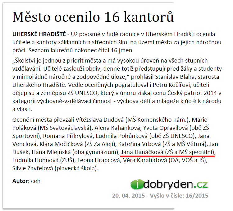 V reprezentativních prostorách hradišťské Reduty v úterý 14. dubna 2015 převzala paní učitelka Jana Hanáčková z rukou místostarosty Města Uherské Hradiště pana PhDr. Ivo Frolce ocenění za vynikající pedagogickou činnost a významný přínos pro výchovu a vzdělávání mladé generace.