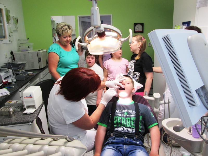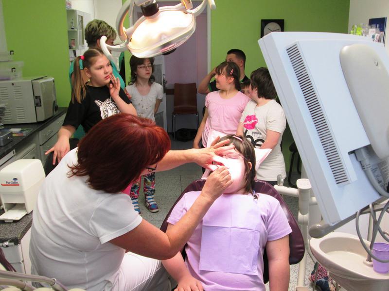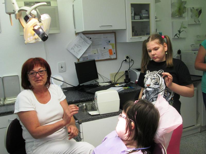 Návštěvu malebné vesničky jsme zahájili prohlídkou zubní ordinace vlídné paní doktorky Yvety Otaševičové.Téměř všechny děti se bez bázně posadily na zubařské křeslo a v jednom případě byla udělena i pochvala za udržované zoubky. Od paní doktorky jsme se dozvěděli, že na základě doporučení ošetřující zubní lédařky je možné se s dítětemm objednat do Baťovy nemocnice ve Zlíně, kde provádějí ošetření chrupu vystrašených dětí pod mírnými sedativy. Tím se dá vyřešit strach a zachránit vykažené zuby.