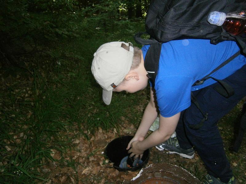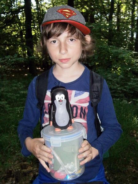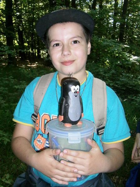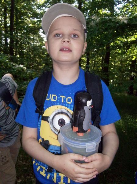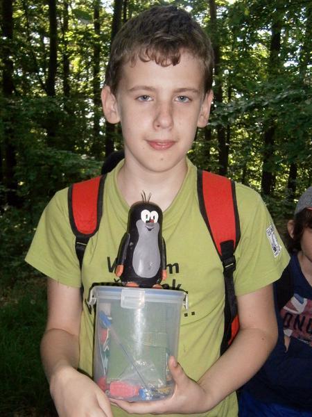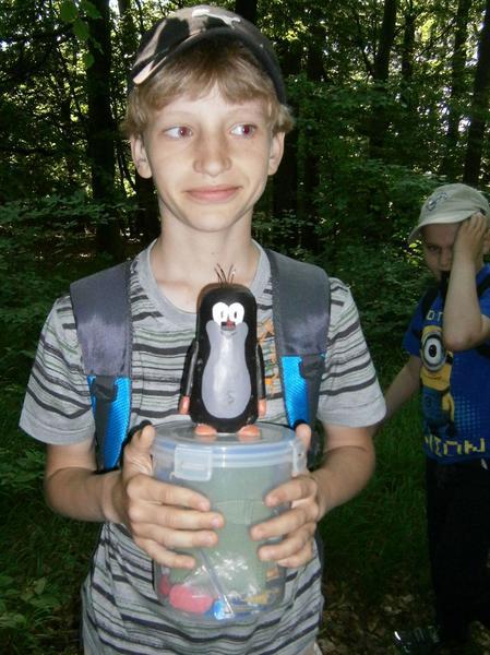 Cestu nám zpestřilo hledání geocachingového pokladu uprostřed lesa. Podle navigace jsme nalezli tajnou schránku, kterou hlídala postava Krtečka a podepsali se do deníku ve schránce obsaženém.