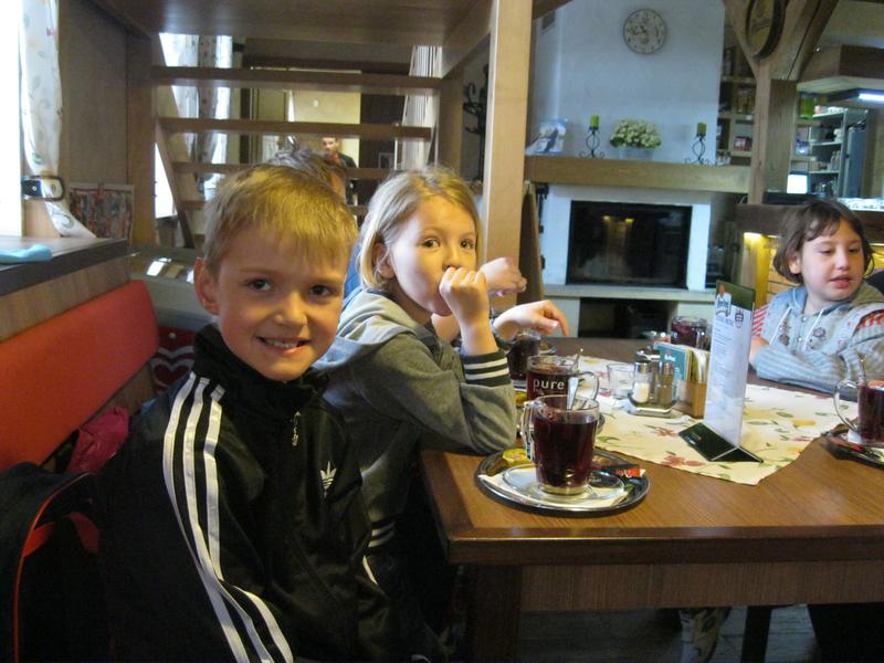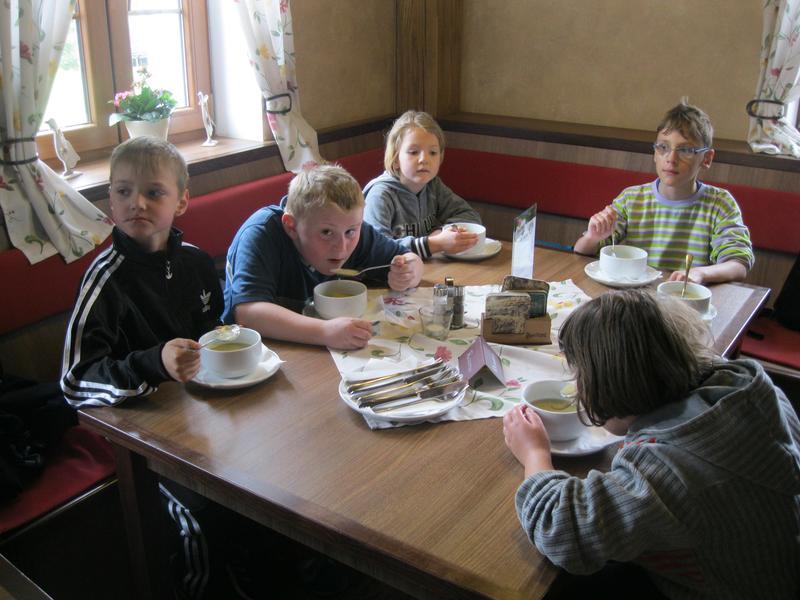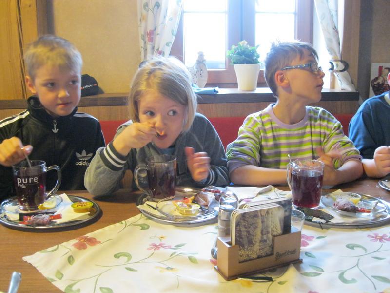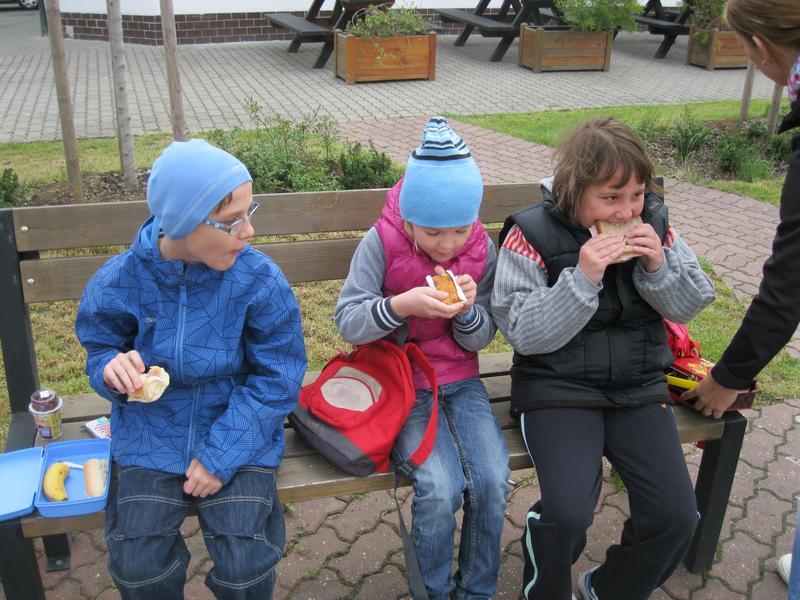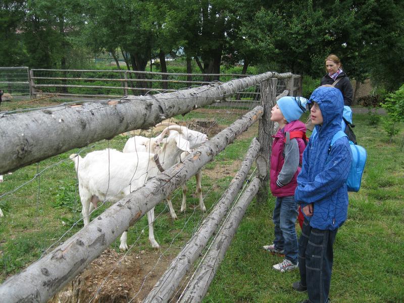 Poznávání zvířat na minifarmě nám zabralo celé dopoledne, jen s malou přestávkou, kdy nás déšť zahnal do útulné hospůdky na čaj. I přesto jsme viděli spoustu zajímavostí - čerstvě ostříhané ovce, slepice, které utekly přes plot a pak nemohly najít cestu zpět, prasnici, která se snažila nakrmit třináct malých selátek, koně, králíky, kačeny, divoké prasata a dokonce i pávy.