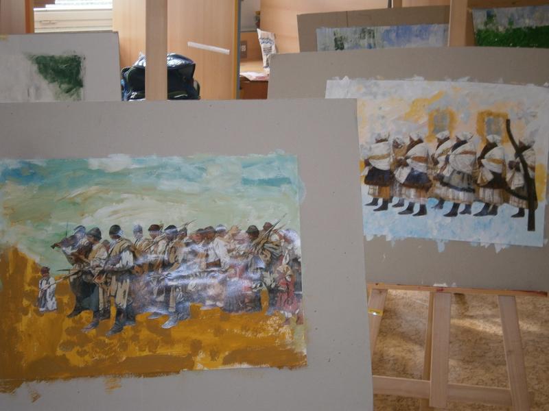 Jako Joža Úprka malovat nedokážeme, ale snažili jsme zachytit alespoň pozadí jeho děl z reprodukcí v kalendáři. Jednotlivé postavy a figury jsme do našich maleb dolepili.