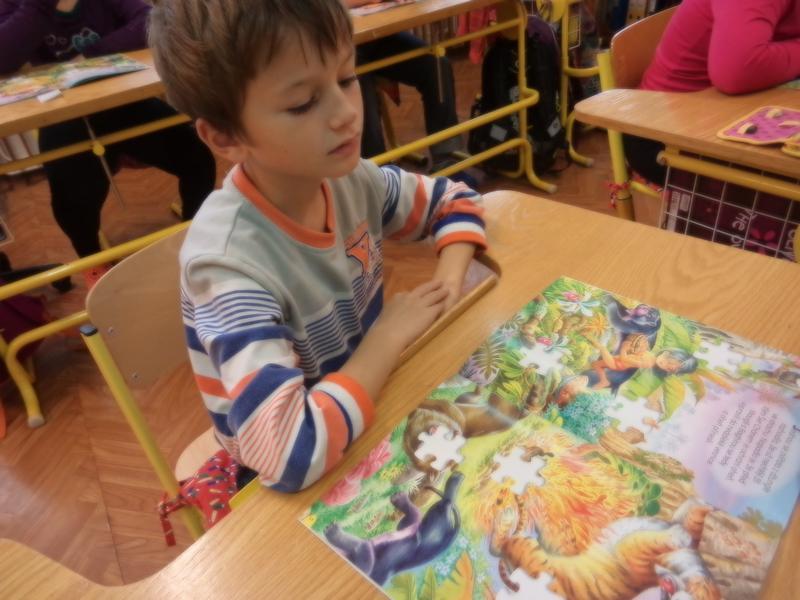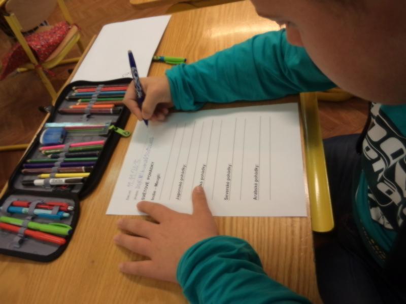 Co je to SVĚT? Pohádky na různých místech naší planety. JAPONSKÉ, ČÍNSKÉ, SEVERSKÉ, ARABSKÉ POHÁDKY? Jaká jména mají hlavní postavy pohádkových příběhů, jaké jsou zvyklosti a oblečení na různých místech? Je to pan král, sultán nebo chán? Seznámili jsme se s "Mauglím" a s jeho pohádkovým příběhem, mladší žáci vykreslovali omalovánku, dolepovali jsme si puzzle do obrázků, starší si vyzkoušeli napsat různá jména hlavních hrdinů. Kniha čínských pohádek je úplně jiná? A jaké je čínské písmo?