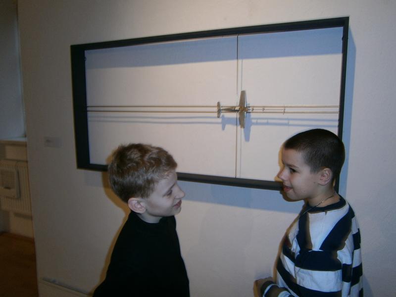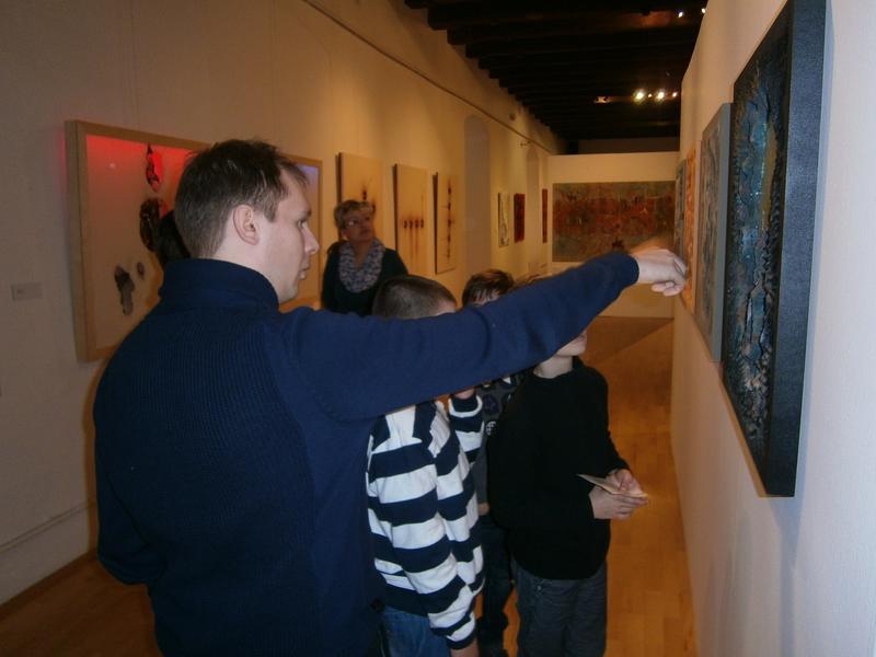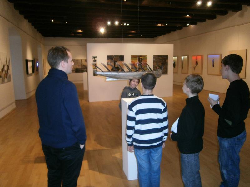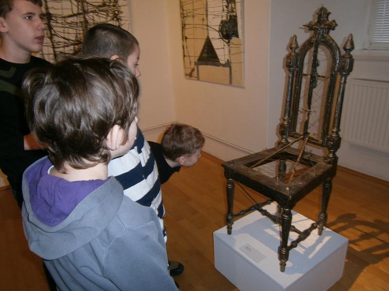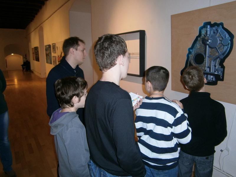 Michal Malina, jeden z autorů výstavy, se setkal se žáky V. třídy přímo v galerii a ochotně odpovídal na zvídavé dotazy o vzniku výtvarných objektů.