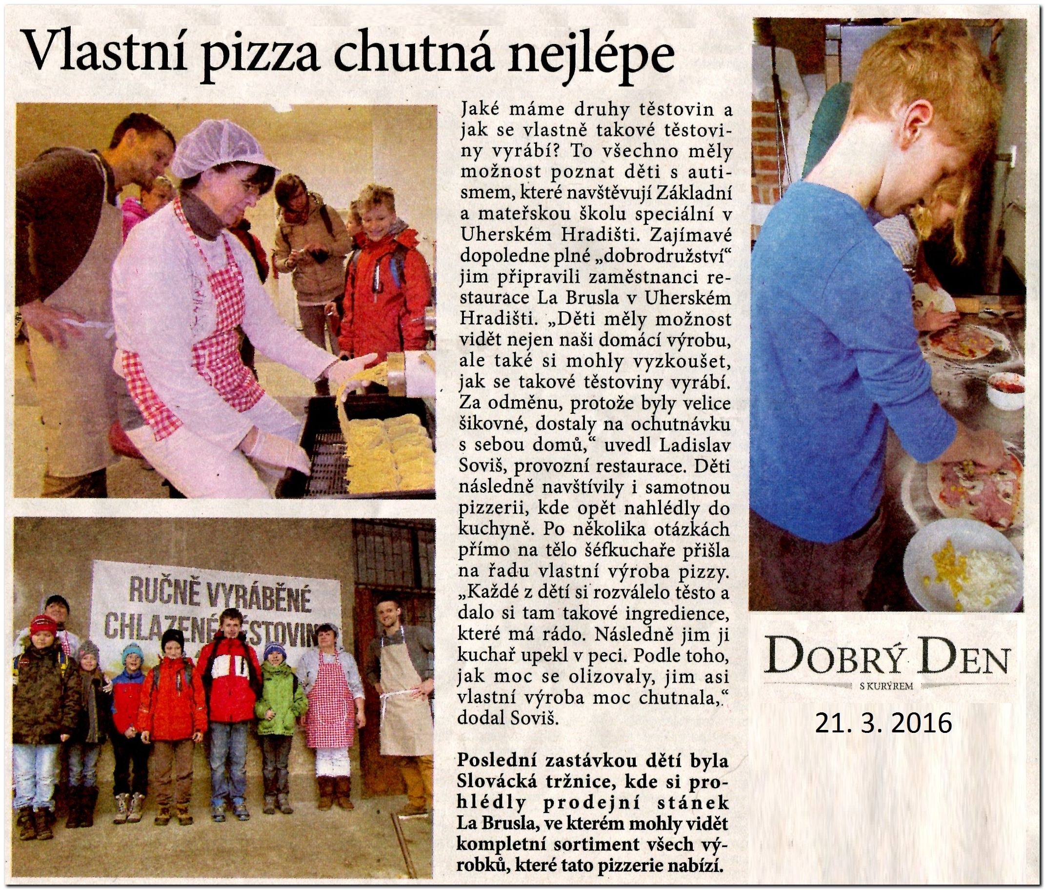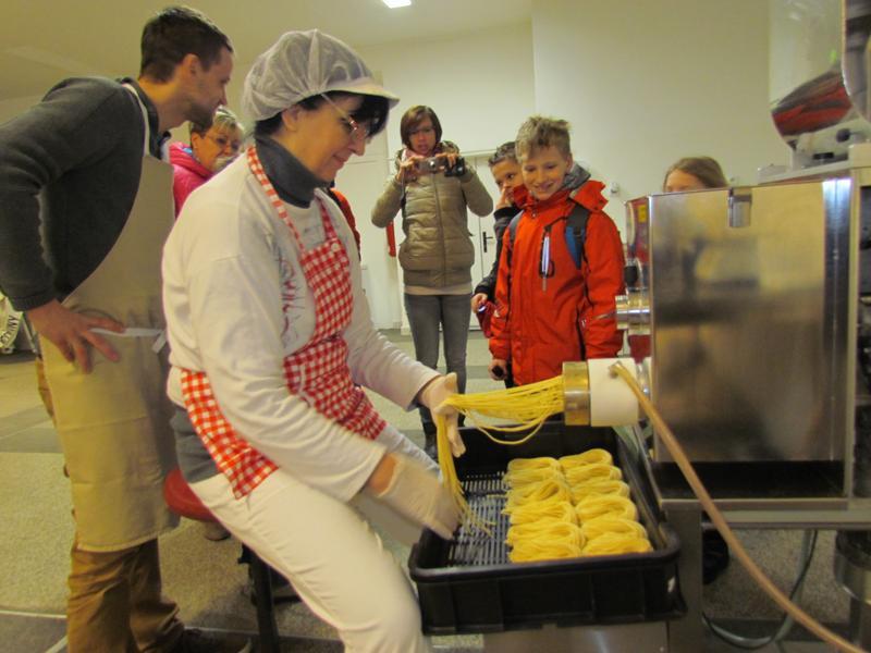 V. třída se vydala na exkurzi do výrobny těstovin La Brusla. Podívali jsme se na domácí výrobu několika druhů čerstvých těstovin, které vyrábí restaurace La Brusla pro svoji vlastní kuchyni i na prodej. Zaujaly nás stroje, do kterých se sype semolinová mouka z Itálie, samy potom uhnětou těsto a přes nástavec vytlačí požadované tvary těstovin.