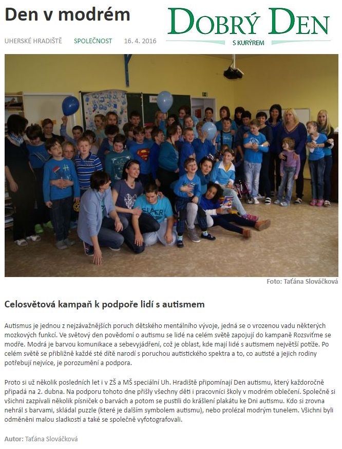 Na podporu tohoto Dne přišly všechny děti i pracovníci školy v modrém oblečení. Společně jsme si zazpívali několi písniček o barvách a potom se pustili do krášlení našeho plakátu ke Dni autismu. Kdo se zrovna nehrál s barvami, skládal puzzle (které je dalším symbolem autismu), nebo prolézal modrým tunelem. Všichni byli odměněni malou sladkostí a také jsme se společně vyfotografovali.