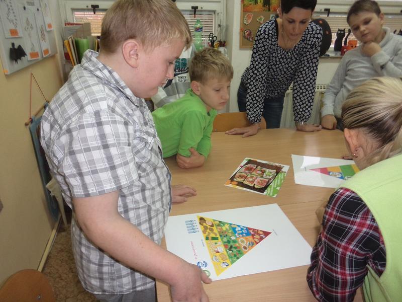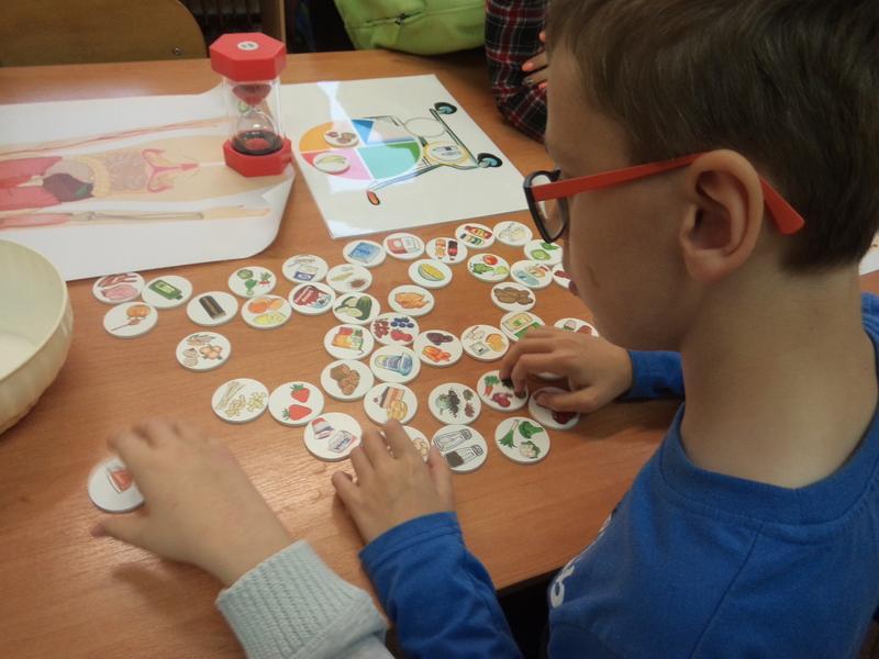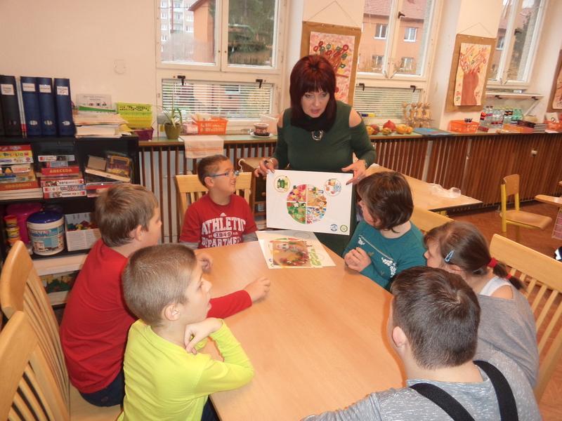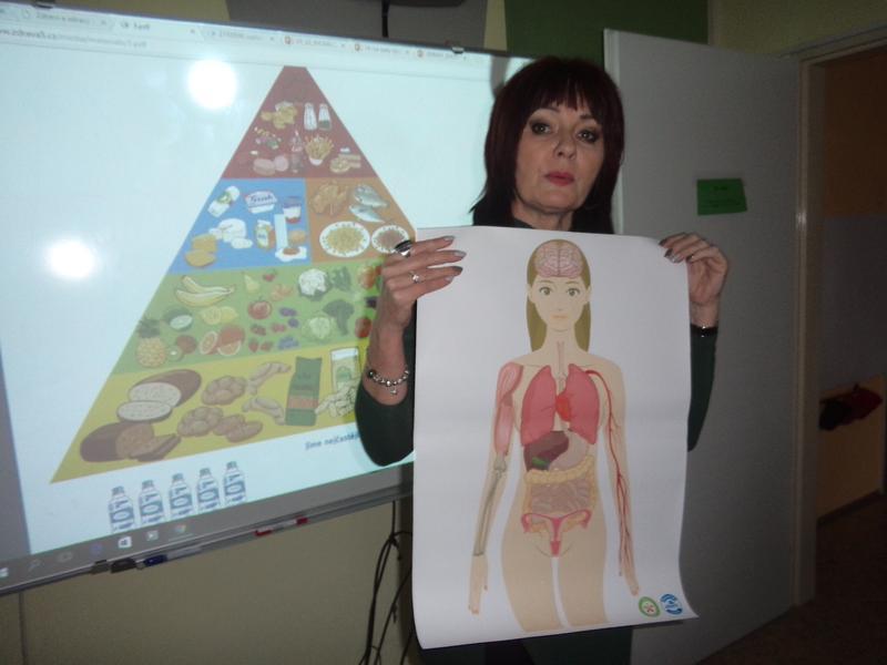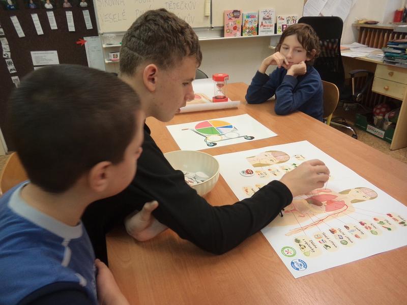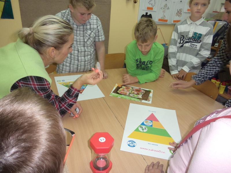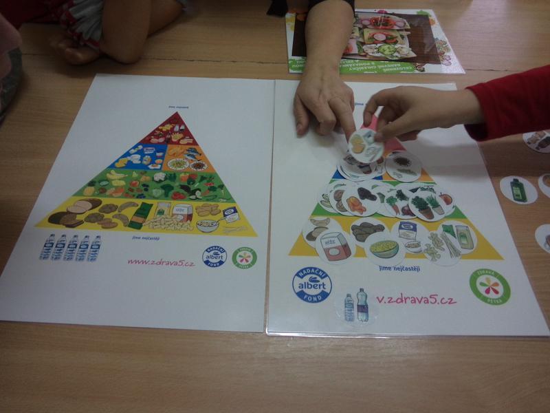 Další činností bylo plněnní úkolů - využili jsme pomůcky z programu "Zdravá pětka" - zdravý výživový talíř, výživová pyramida a lidské tělo.