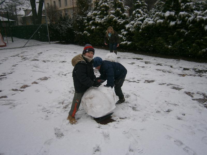 I když podmínky nebyly zrovna ideální, za chvíli jsme se pyšnili sněhulákem. První snížek jsme si opravdu užili.