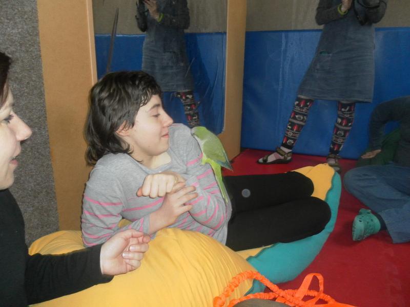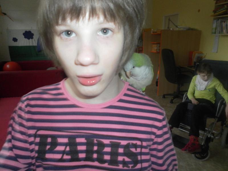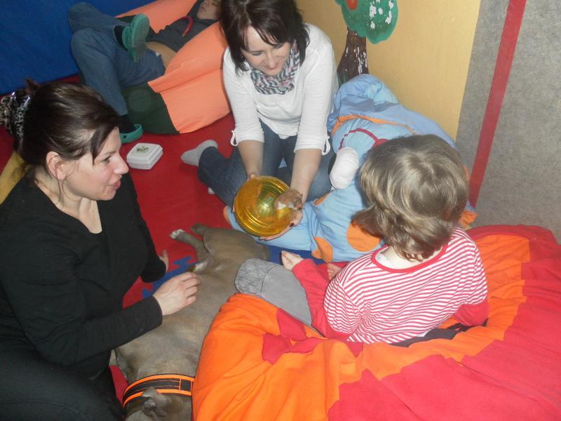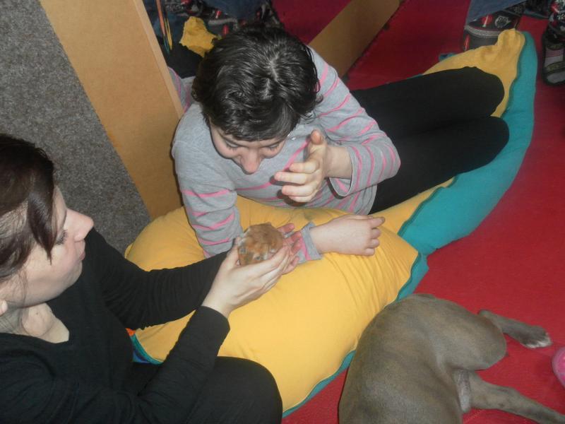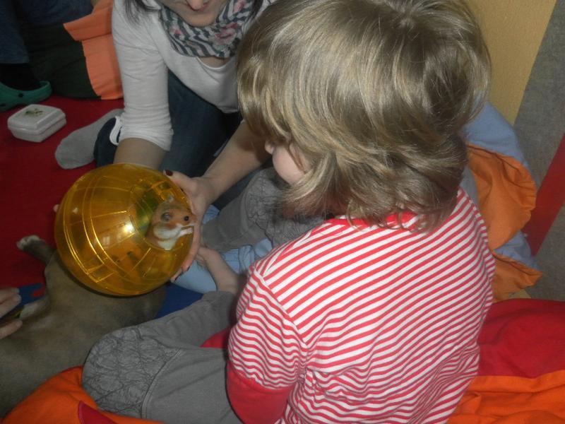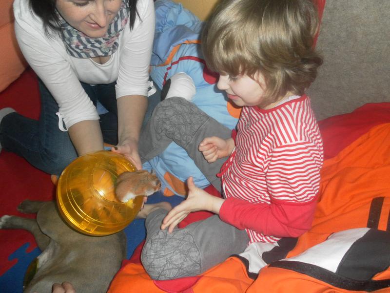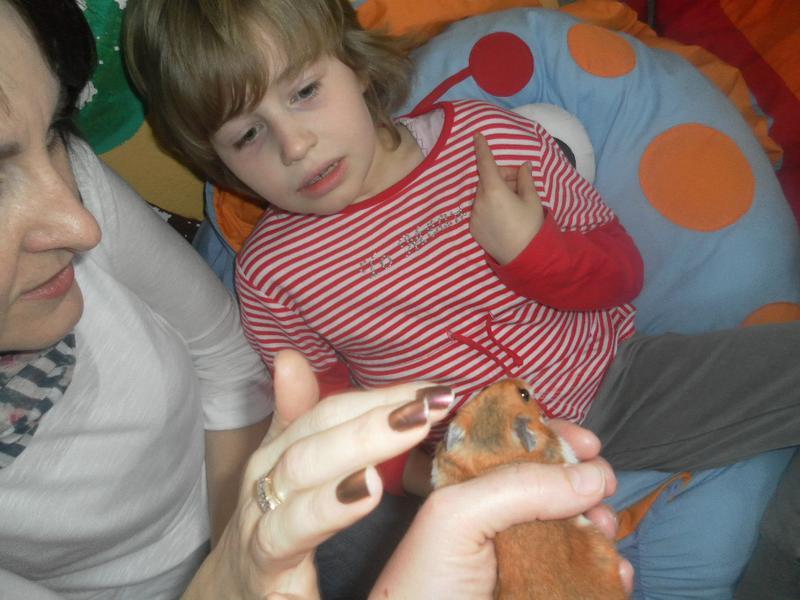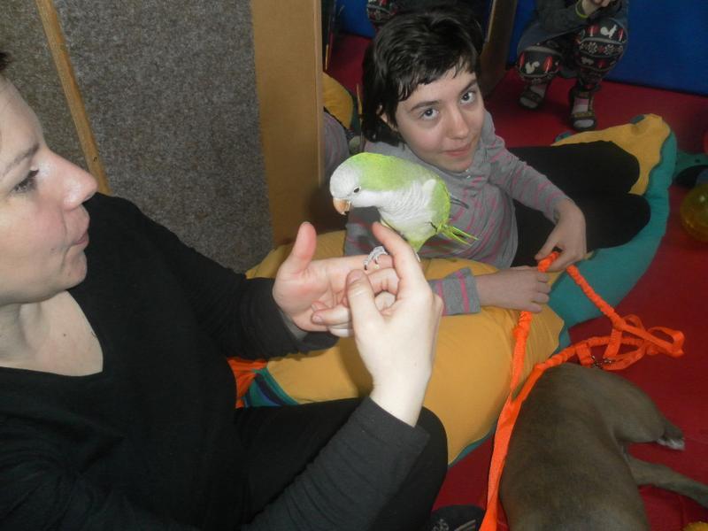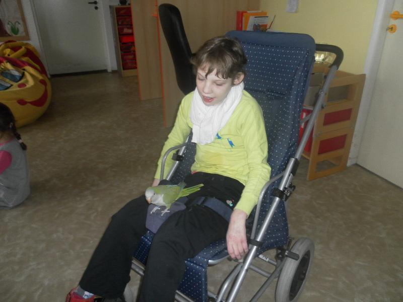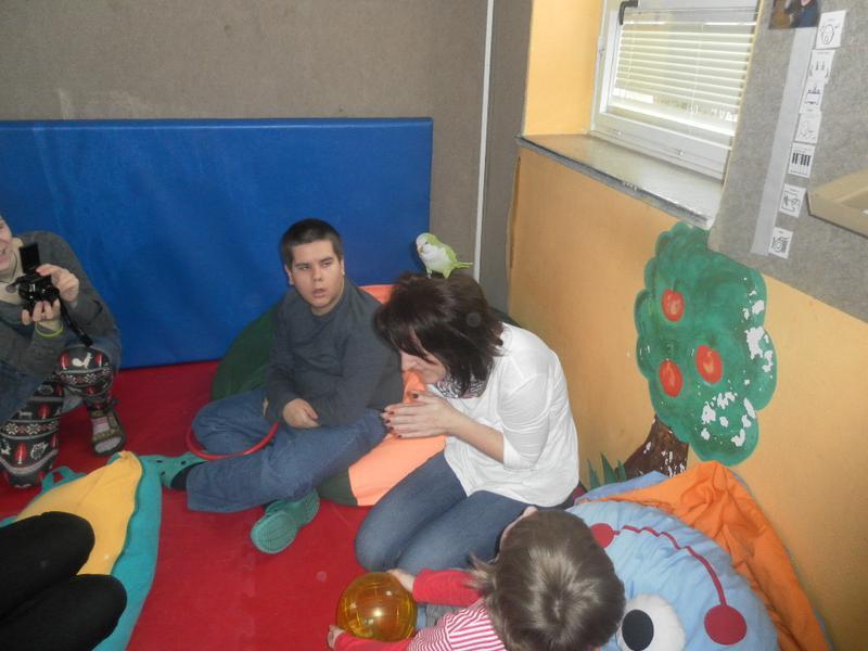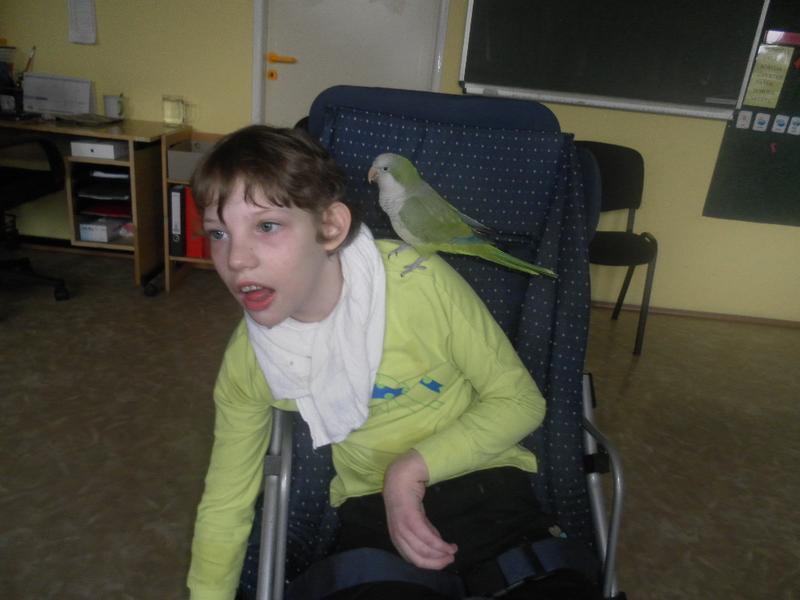 Dnes jsme poprvé vyzkoušeli novou formu terapie – terapii se zvířátky. Klasickou prožitkovou canisterapii tentokrát nahradilo polohování se psem Marlinem, přítomnost papouška - mníška šedého Polly a křečka Stewarda.