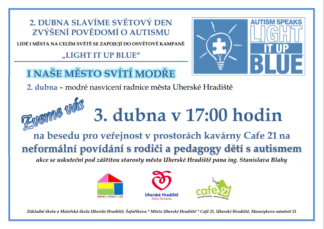 U příležitosti Světového dne zvýšení povědomí o autismu naše škola pod záštitou starosty Města Uherské Hradiště pana ing. Stanislava Blahy a ve spolupráci s Cafe 21 na Masarykově náměstí v Uherském Hradišti a Regionem Slovácko pořádá osvětovou kampaň.