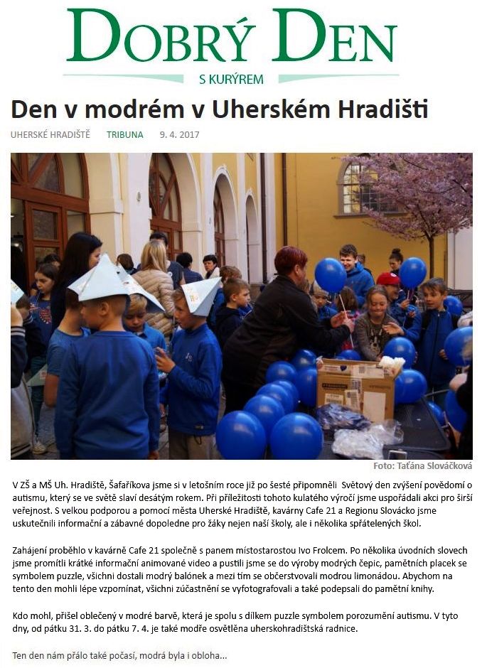 V naší škole si v letošním roce již po šesté připomínáme Světový den zvýšení povědomí o autismu, který se ve světě slaví desátým rokem. Při příležitosti tohoto kulatého výročí jsme uspořádali akci pro širší veřejnost. S velkou podporou a pomocí města Uherské Hradiště, kavárny Cafe 21 a Regionu Slovácko jsme uskutečnili informační a zábavné dopoledne pro žáky nejen naší školy, ale i několika spřátelených škol, jako jsou ZŠ Větrná, ZŠ U Pálenice Kunovice, ZŠ UNESCO, ZŠ Sportovní a ZŠ Za Alejí.