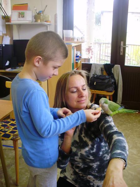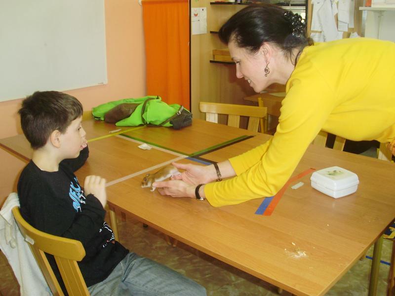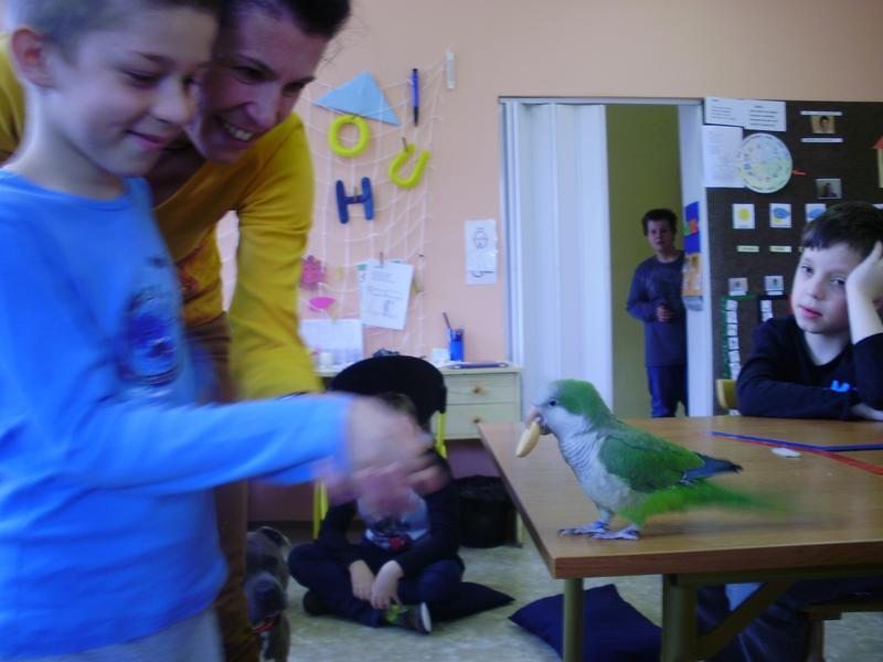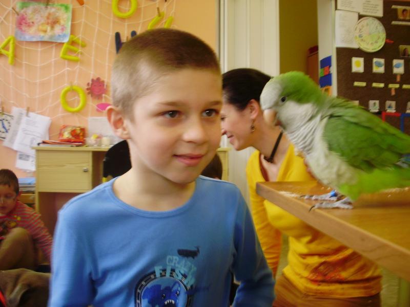 Učili jsme se různé dovednosti, mimo jiné jakou zaujmout polohu, když na nás zaútočí pes. S křečkem byla legrace, po třídě se proháněl v průhledné kouli. Papoušek si s námi povídal, krmili jsme si ho a těm, co dokázali být v klidu, si sedl na rameno.