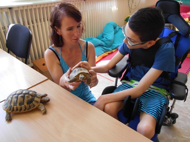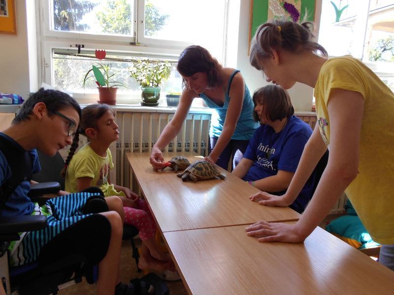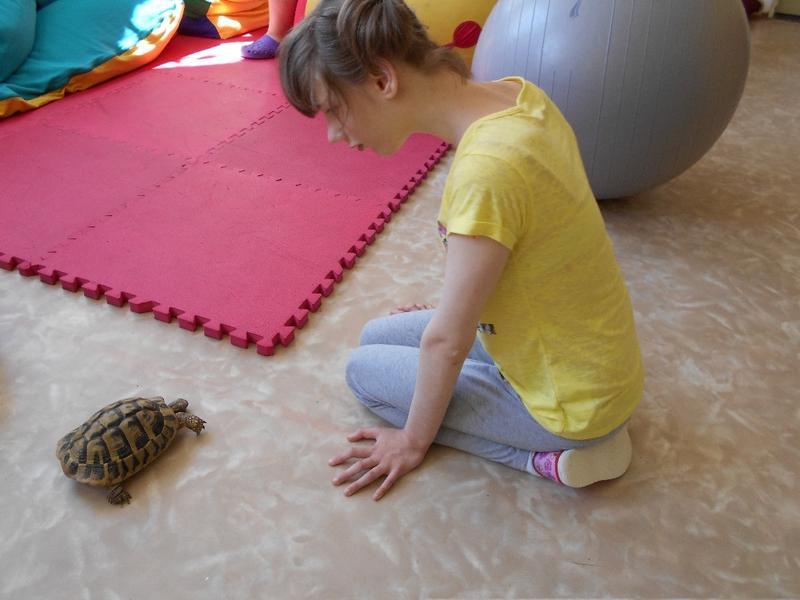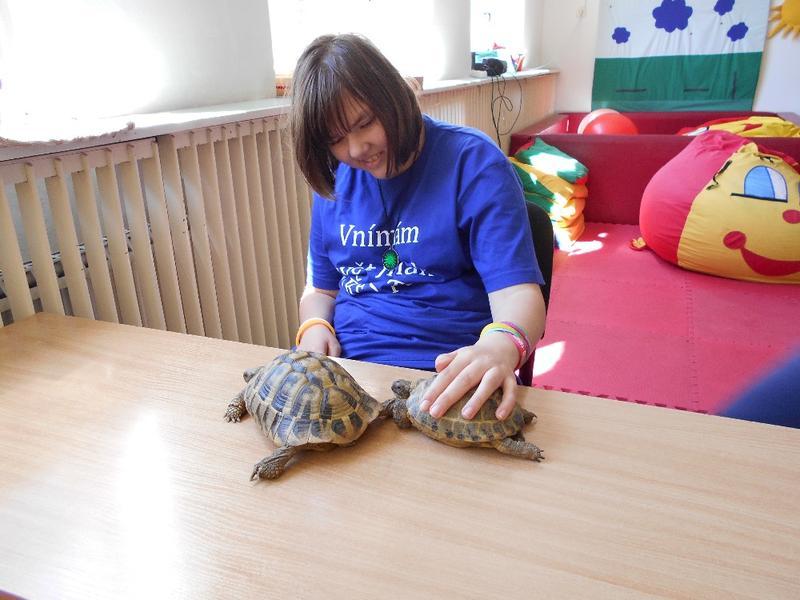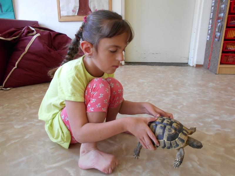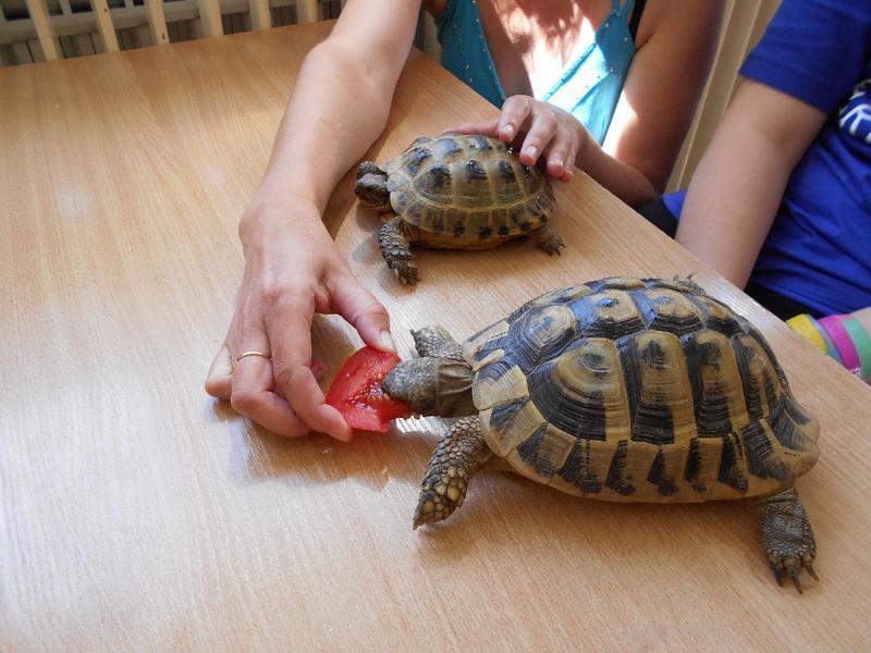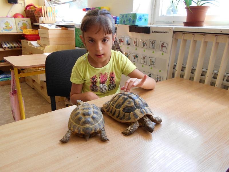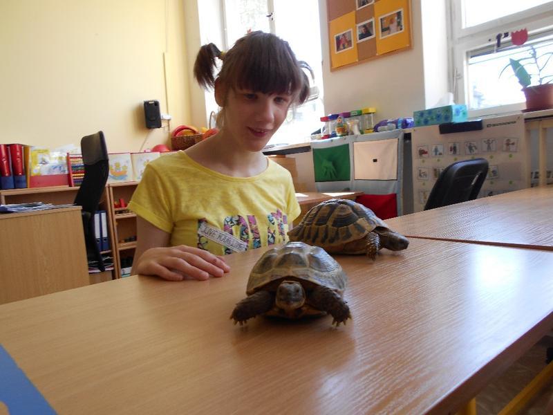 Dvě suchozemské želvy Sáru a Jůlijuse jsme si všichni zkusili vzít do ruky, pohladit a nakonec důkladně prohlédnout. Nakrmili jsme je rajčetem a listem z pampelišky. Nemohli jsme se na ně vynadívat a taky jsme se od nich naučili důležitou věc. Ukázaly nám, že se mylně říká "pomalý jako želva". Želvy se rychle vydaly zkoumat naši třídu. Zalezly do každého koutu a my jsme si s nimi na závěr zahráli na schovávanou.