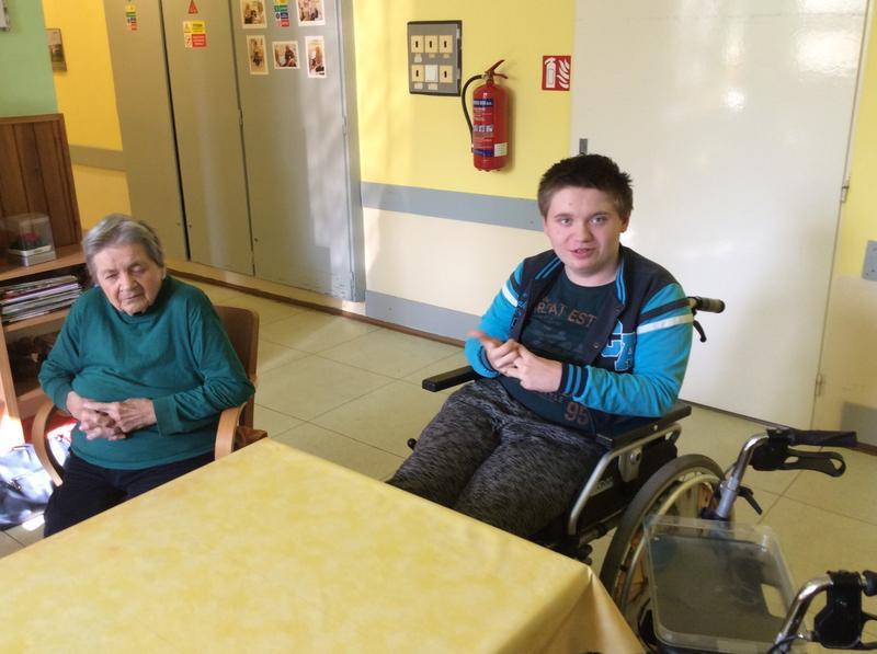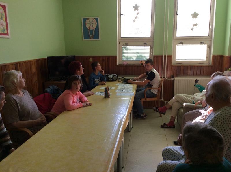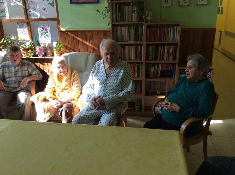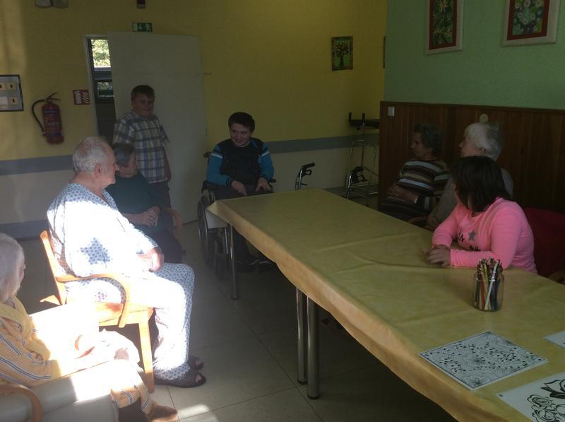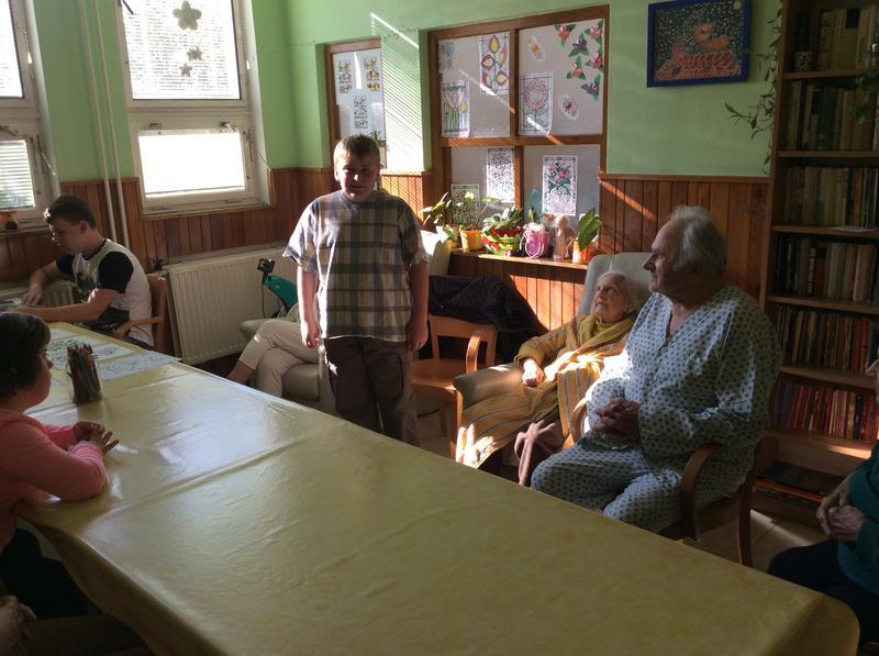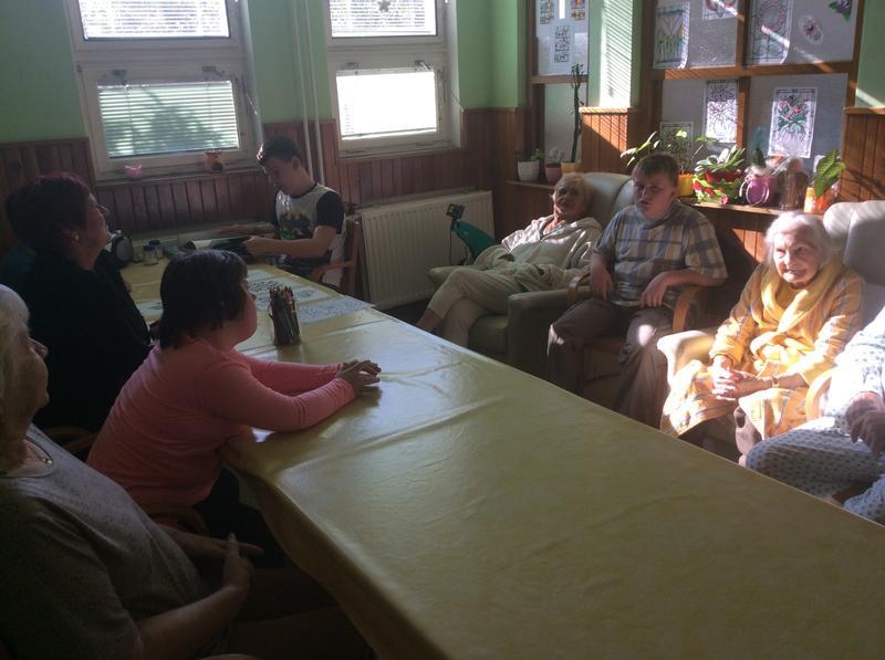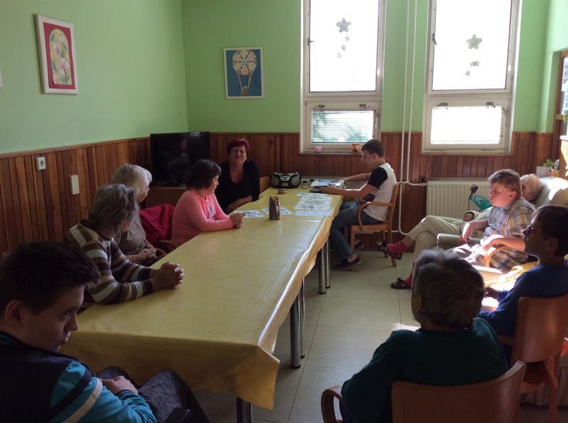 Naše první, úvodní setkání jsme věnovali vzájemnému seznámení s některými klienty tohoto zařízení. Žáci si připravili pro babičky a dědečky krátké povídání o sobě a na oplátku se taky dozvěděli něco od klientů Zdravotně sociálního střediska. Na závěr našeho prvního setkání jsme si zazpívali pár písniček a po hodince společného povídaní jsme se museli rozloučit. Příští pondělí se vydáme za babičkami a dědečky znovu.