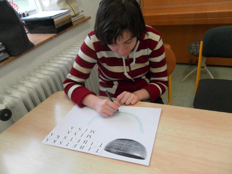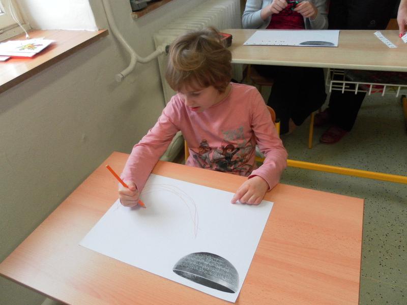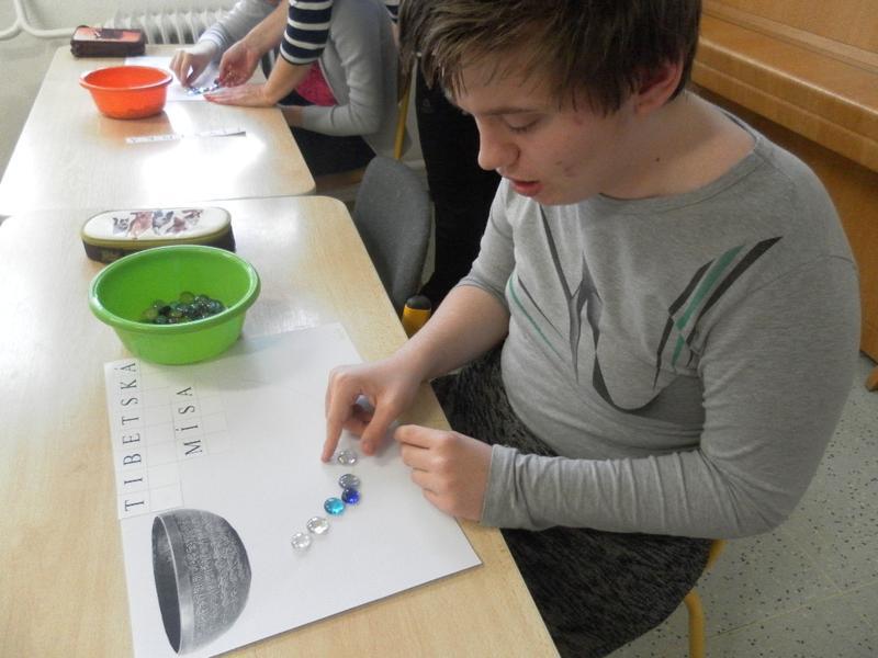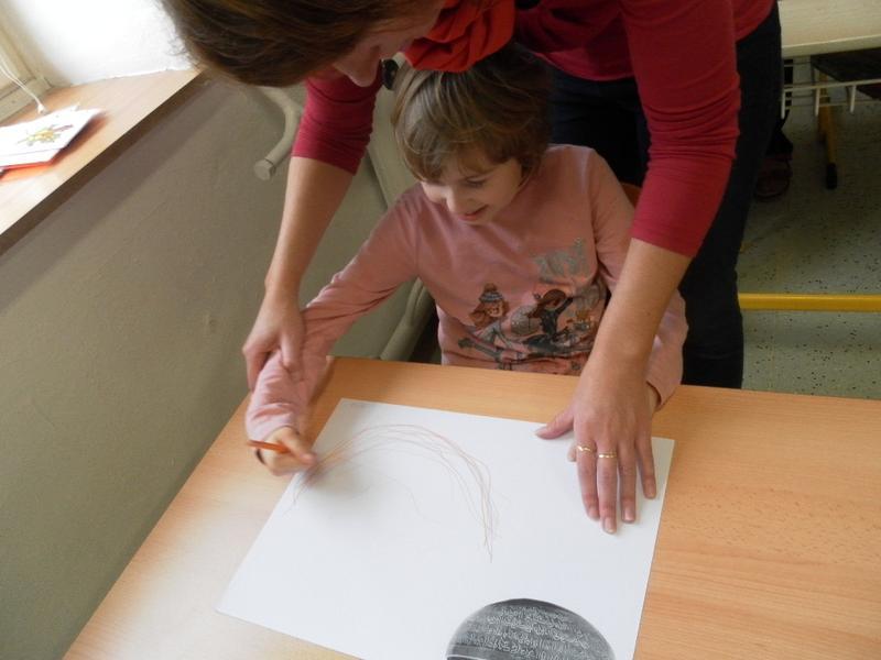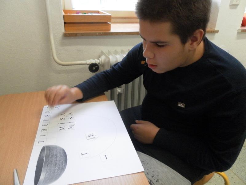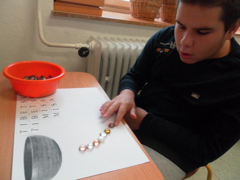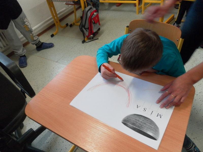 Společně se třeťáky jsme se poté rozhodli, že po ukončení sezení vyzkoušíme něco nového, a to propojit muzikoterapii se smyslovou a rozumovou výchovou. Děti doplňovaly písmena podle vzoru, prováděly uvolňovací cvičení (dolní oblouk dle tvaru tibetské mísy). Střídaly barvy, mnohé z nich se snažily pracovat samostatně.