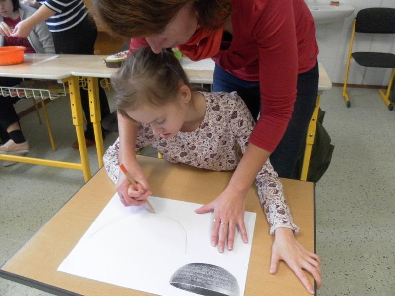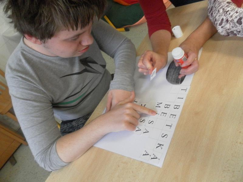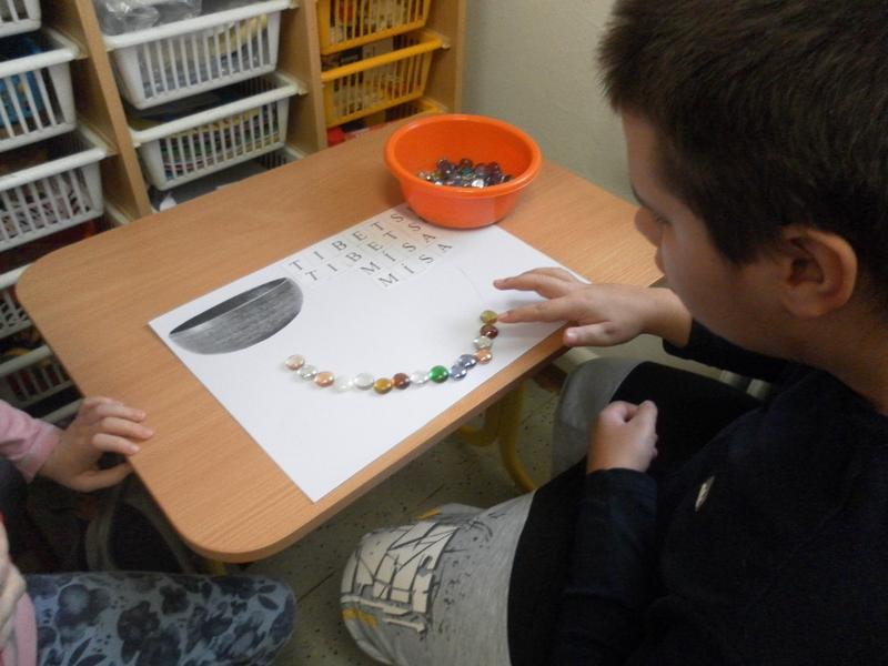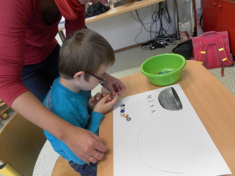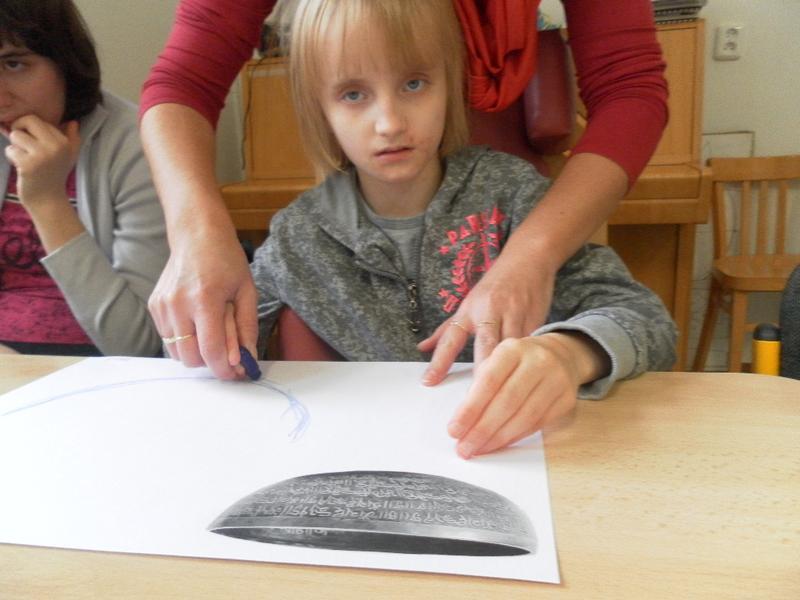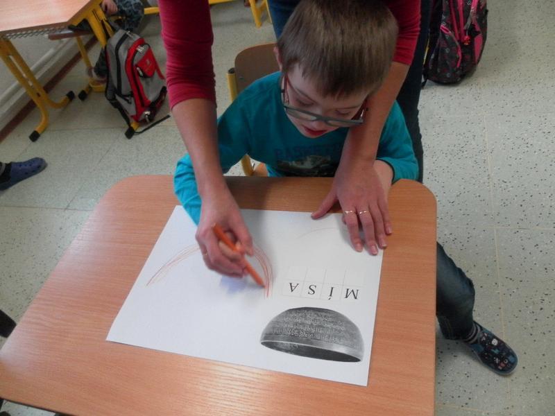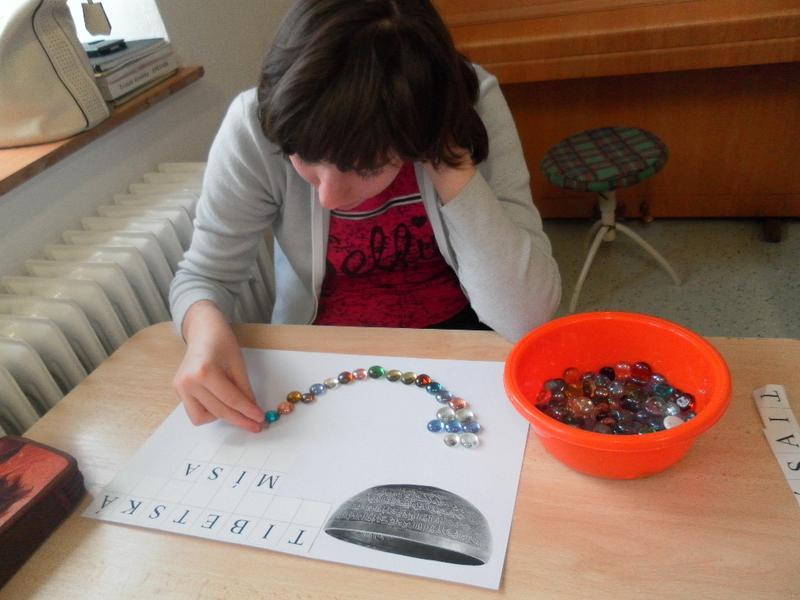 Společně se třeťáky jsme se poté rozhodli, že po ukončení sezení vyzkoušíme něco nového, a to propojit muzikoterapii se smyslovou a rozumovou výchovou. Děti doplňovaly písmena podle vzoru, prováděly uvolňovací cvičení (dolní oblouk dle tvaru tibetské mísy). Střídaly barvy, mnohé z nich se snažily pracovat samostatně.