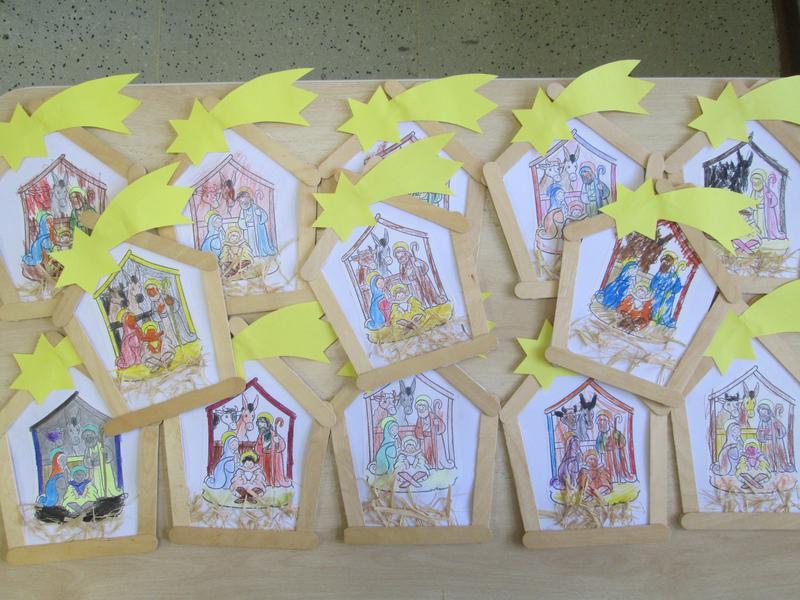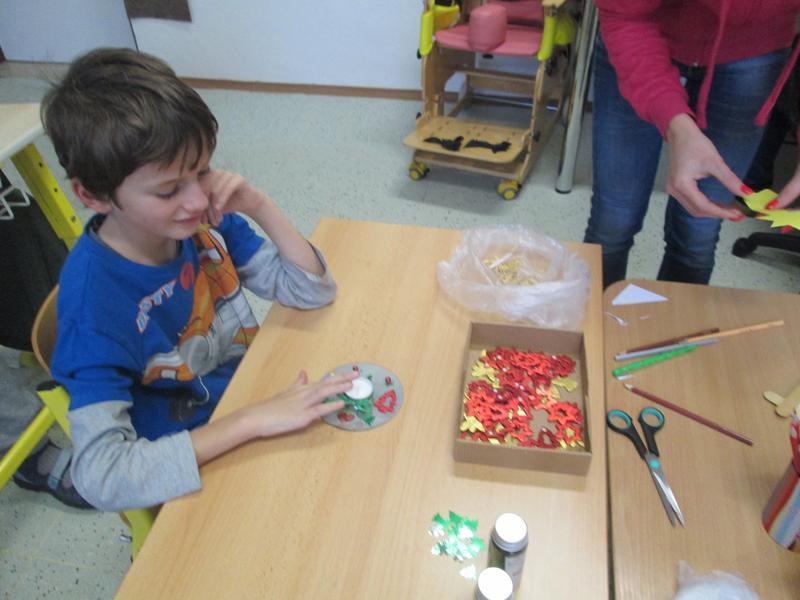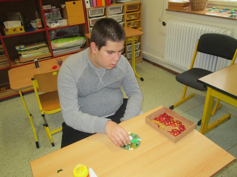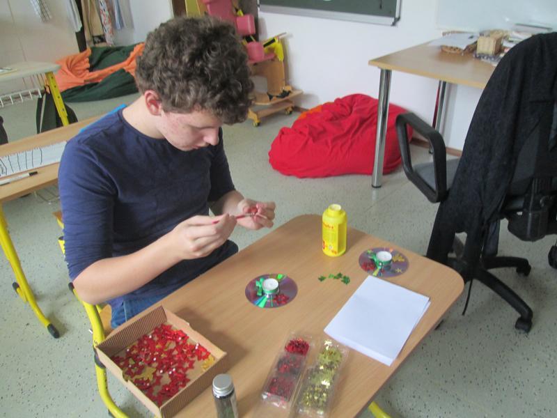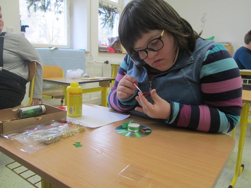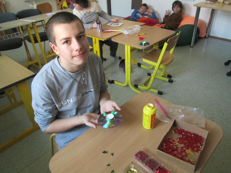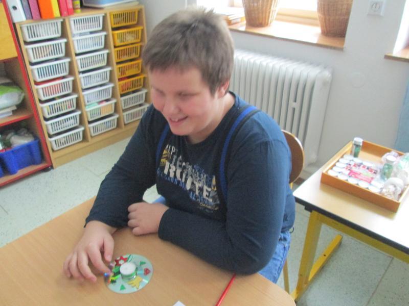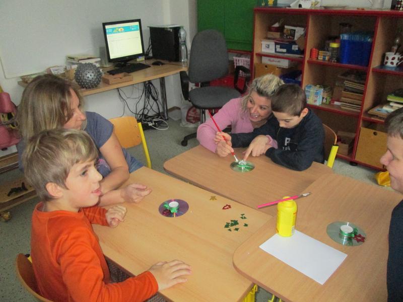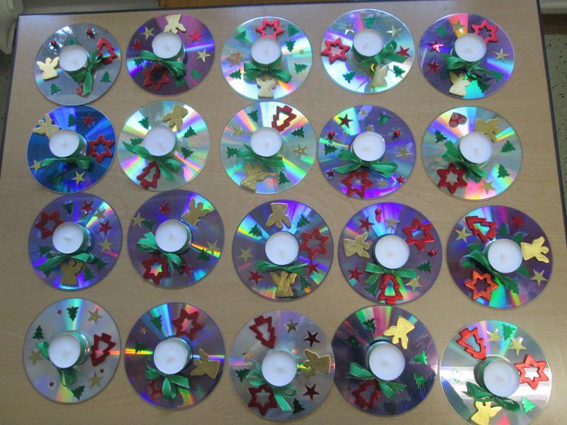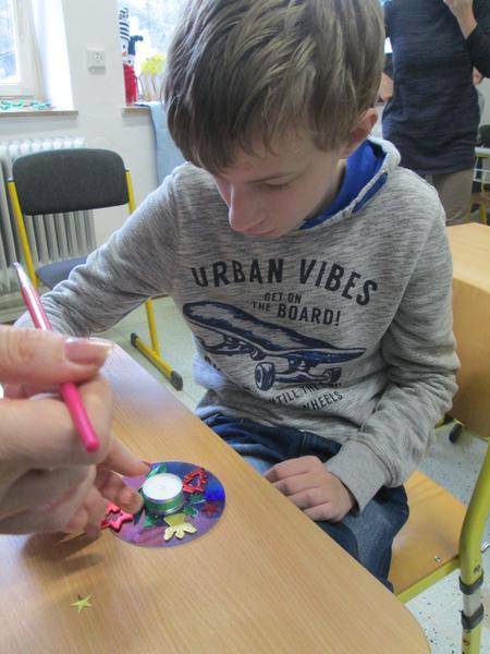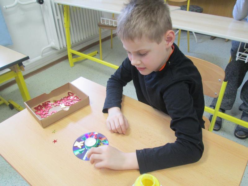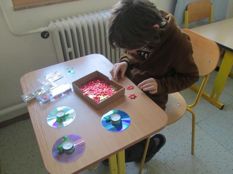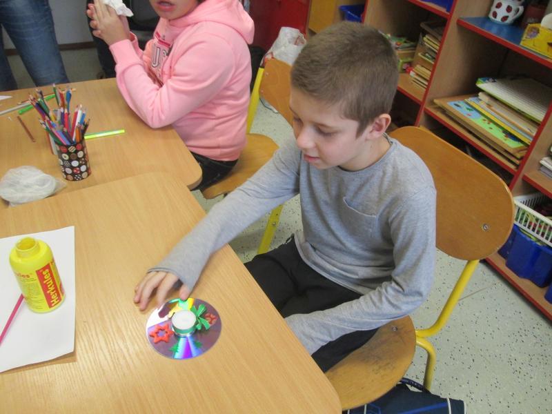 Děti si vyrobily vánoční svícen a betlém. K výrobě svícnu jsme použili staré CD, na které jsme připevnili svíčku s mašličkou a drobné ozdůbky, které jsme nalepili na jeho lesklou stranu. Betlém jsme vytvořili z lékařských špachtlí, omalovánky, lýka a komety.