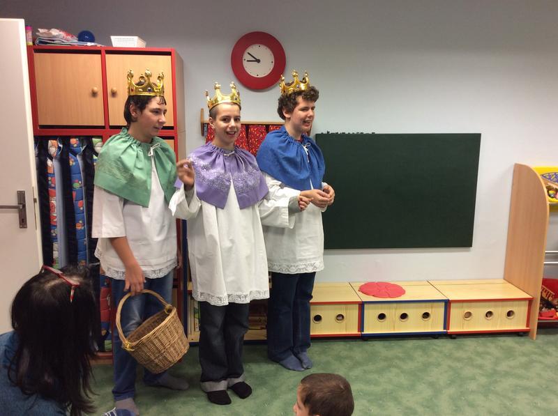 Písničkou My tři králové jdeme k vám přišli potěšit Kašpar, Melichar a Baltazar děti a paní učitelky z MŠ. Věříme že tato vzácná návštěva až z dálného Východu naše malé kamarády potěšila a už teď jim můžeme slíbit, že příští rok jim přijdeme požehnat znovu.