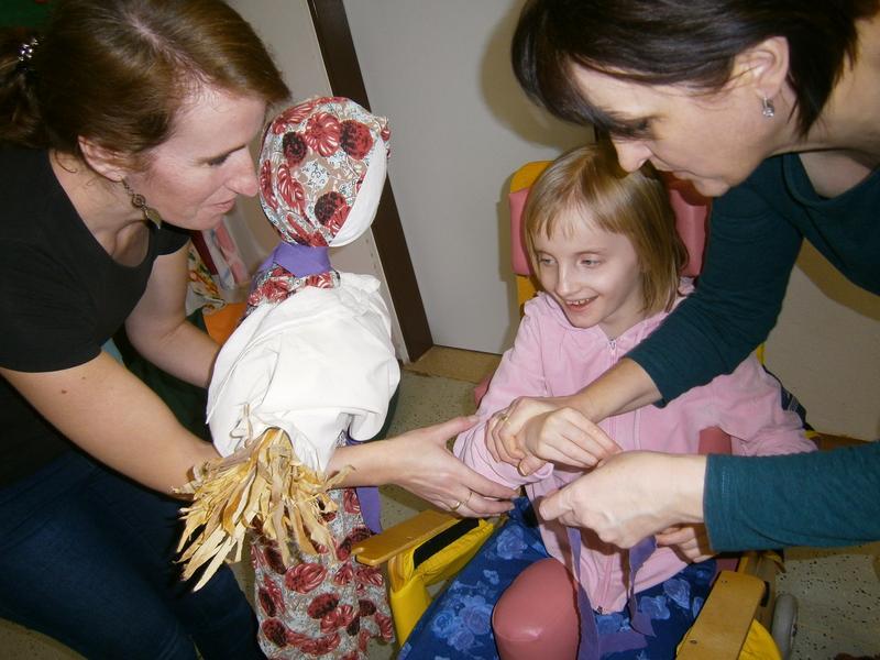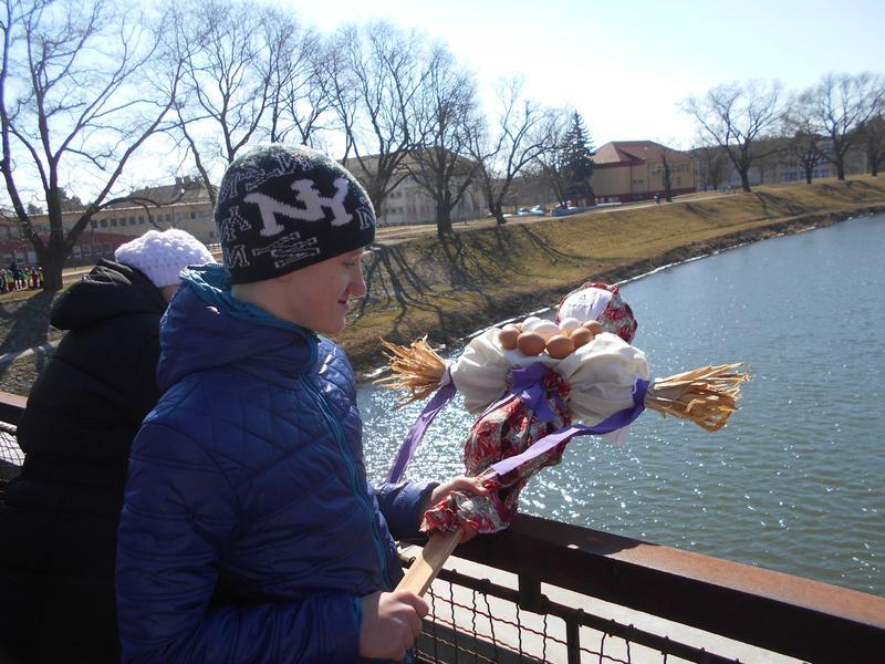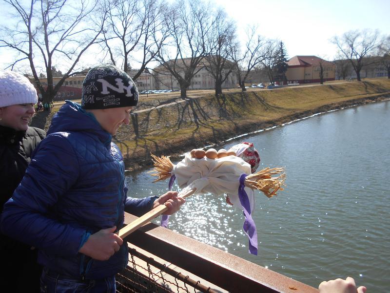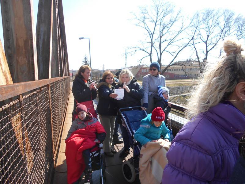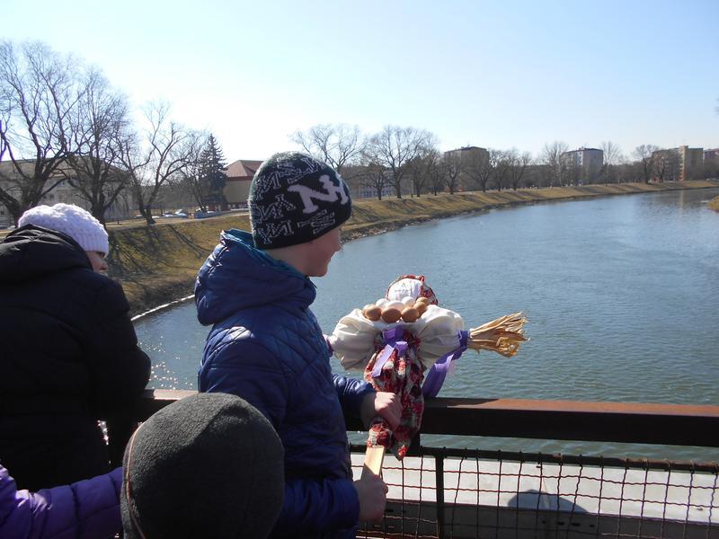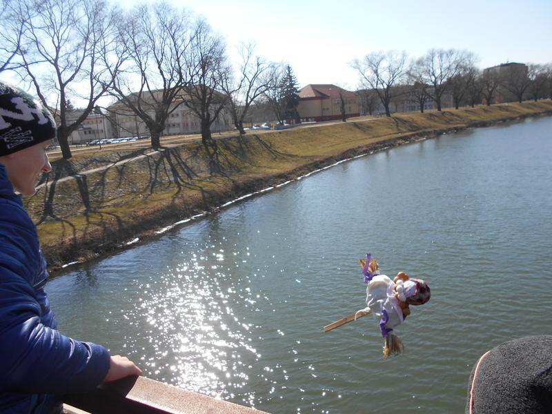 Dnešní společnou vycházku jsme zakončili vhozením Moreny do řeky Moravy za doprovodu říkadel, hudby a písní.