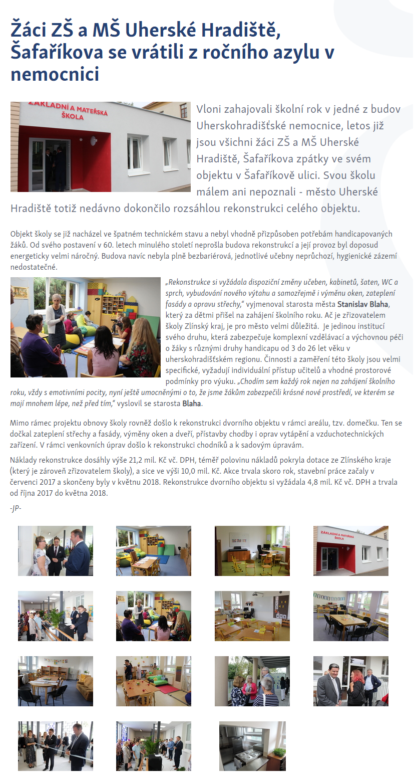 První den letošního školního roku byl pro žáky a zaměstnance naší školy dnem velmi svátečním. Po ročním azylu v areálu Uherskohradišťské nemocnice, a.s. se vrátila výuka do nově zrekonstruované budovy na Šafaříkově ulici.