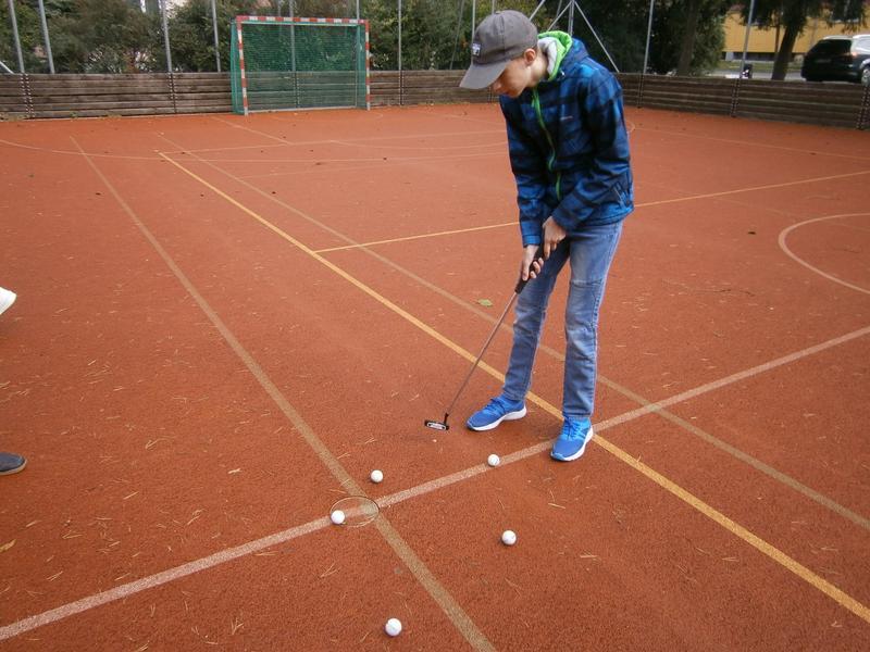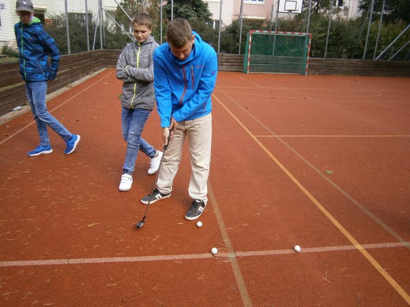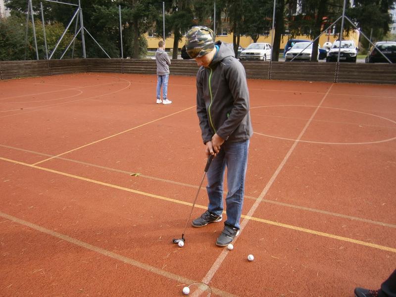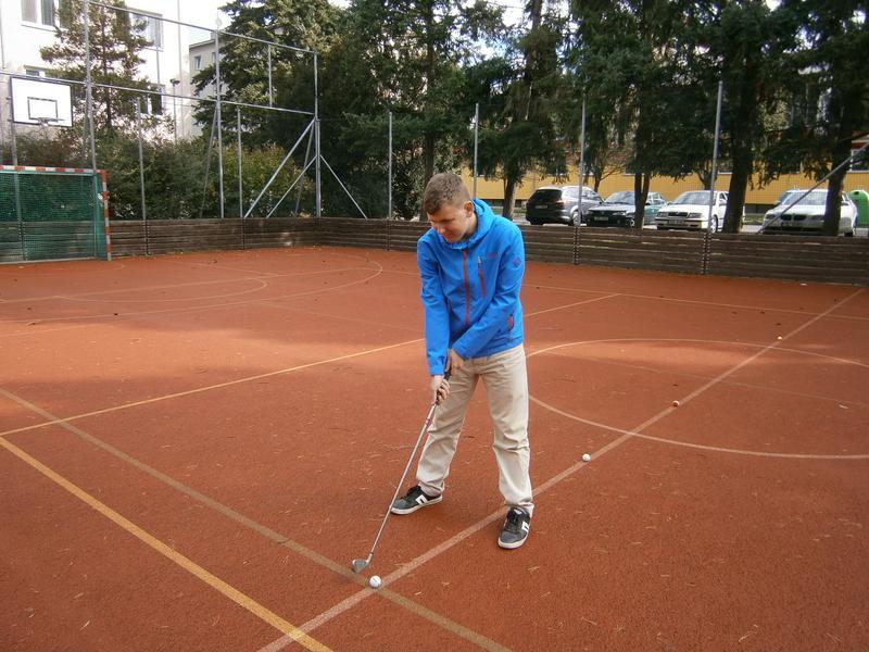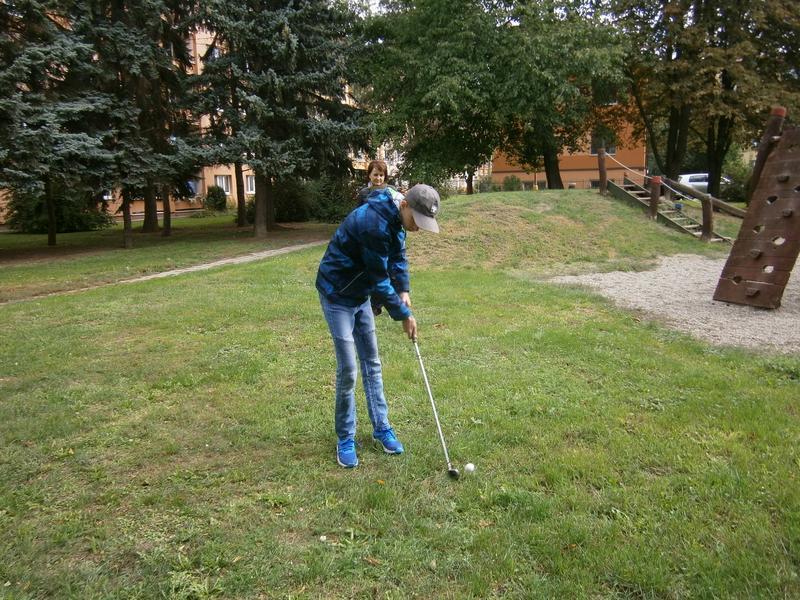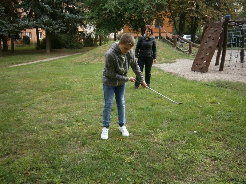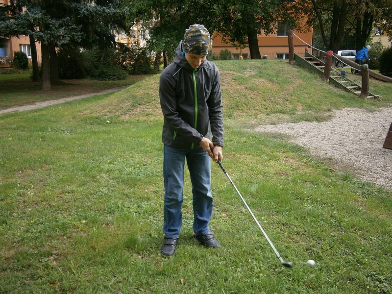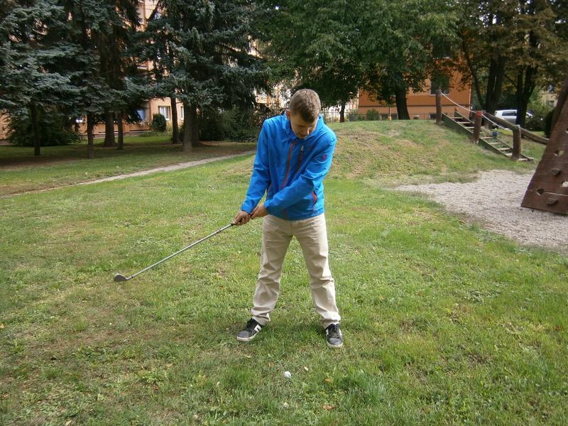Odpalování míčku, práci s holí, míření a základní pravidla golfu jsme si včera vyzkoušeli pod vedením paní vychovatelky Radky. Zkoušeli jsme odpalování na dálku i do jamky, hráli jsme na tvrdém terénu i na "greenu".
