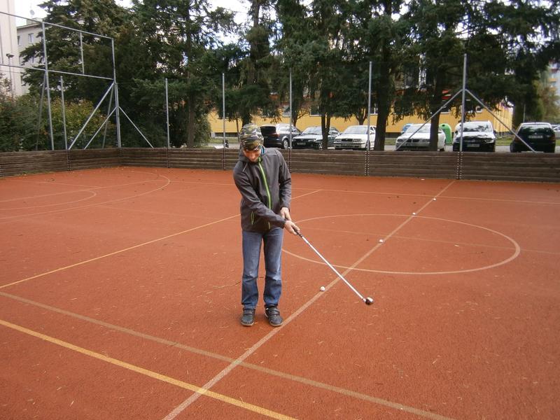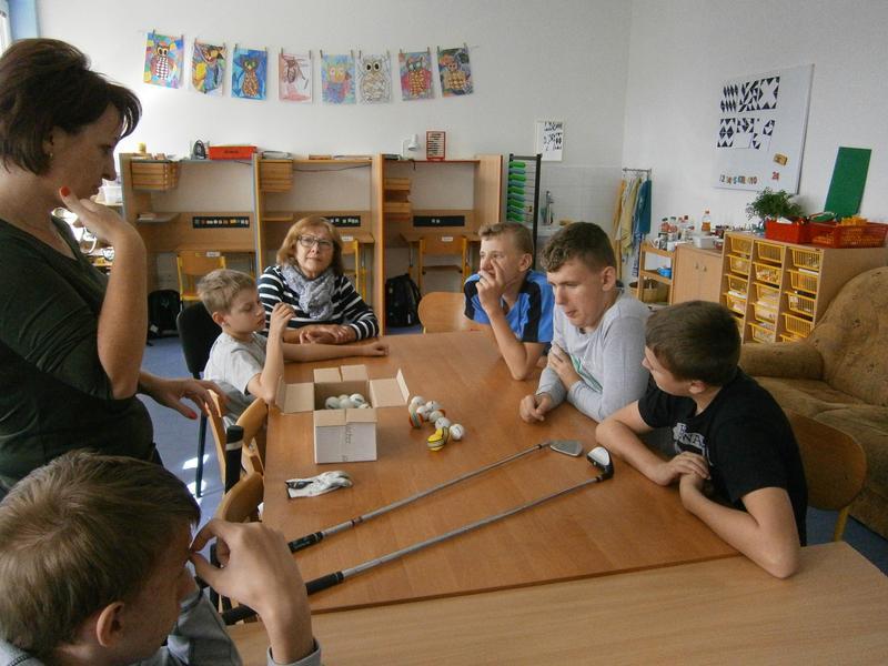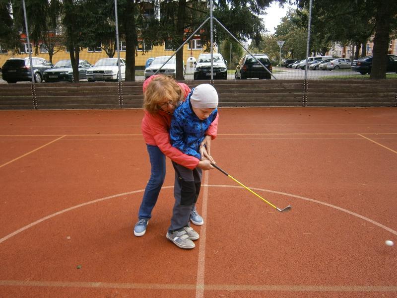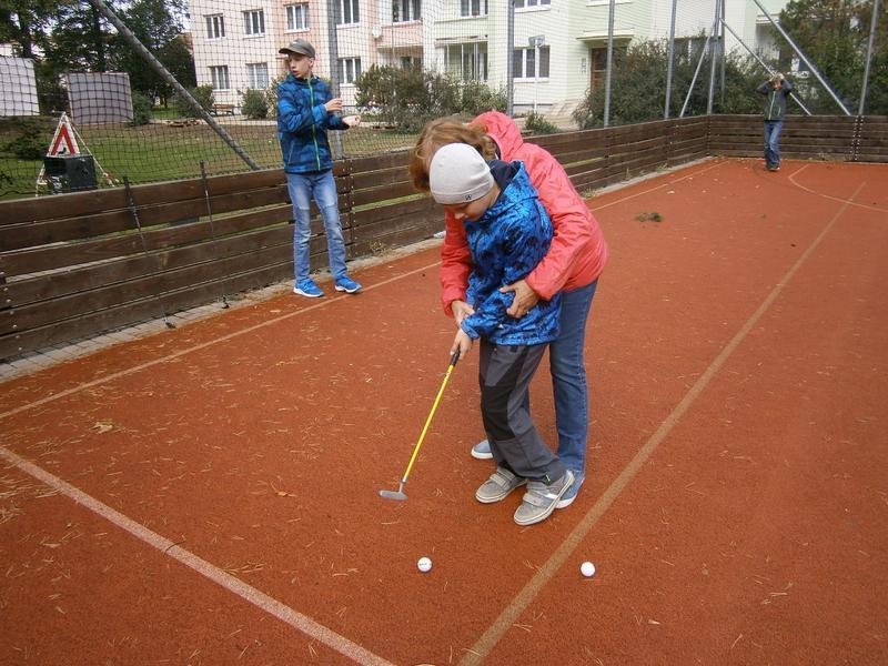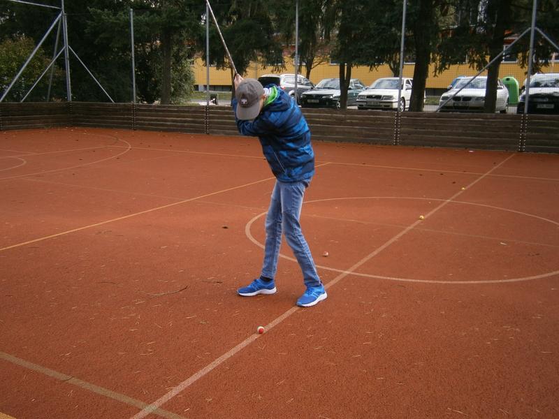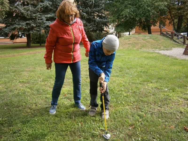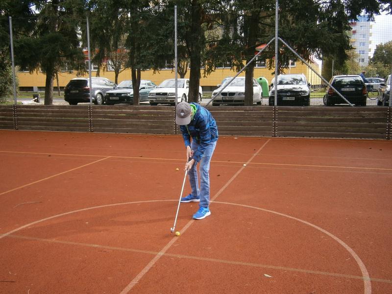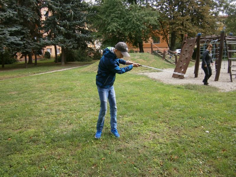 Odpalování míčku, práci s holí, míření a základní pravidla golfu jsme si včera vyzkoušeli pod vedením paní vychovatelky Radky. Zkoušeli jsme odpalování na dálku i do jamky, hráli jsme na tvrdém terénu i na "greenu".