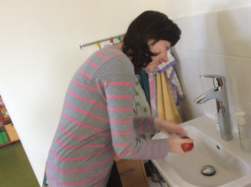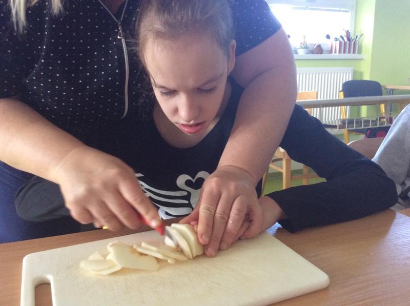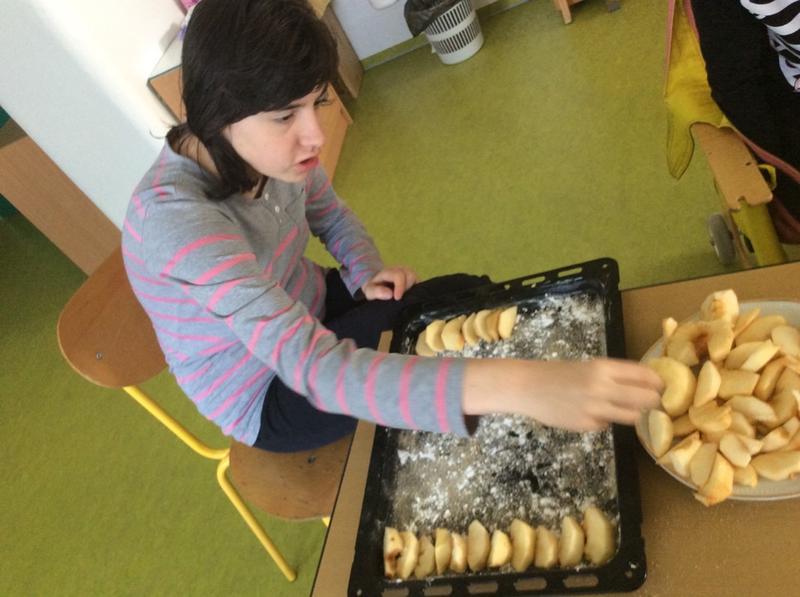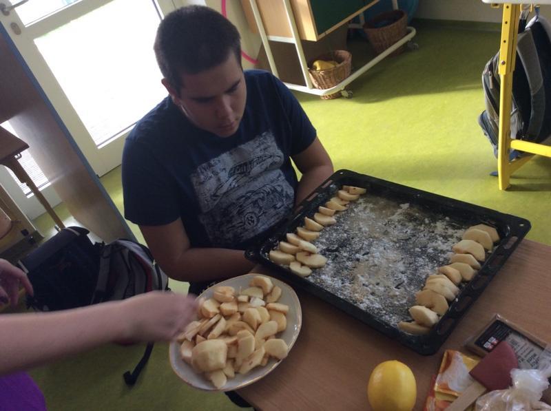 Dnes jsme společně tak trochu experimentovali. Místo klasického postupu pečení jsme zvolili opačný postup - nejprve jsme vyložili pekáč na plátky nakrájenými jablky a potom teprve zhotovili těsto. K