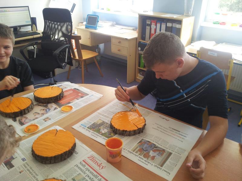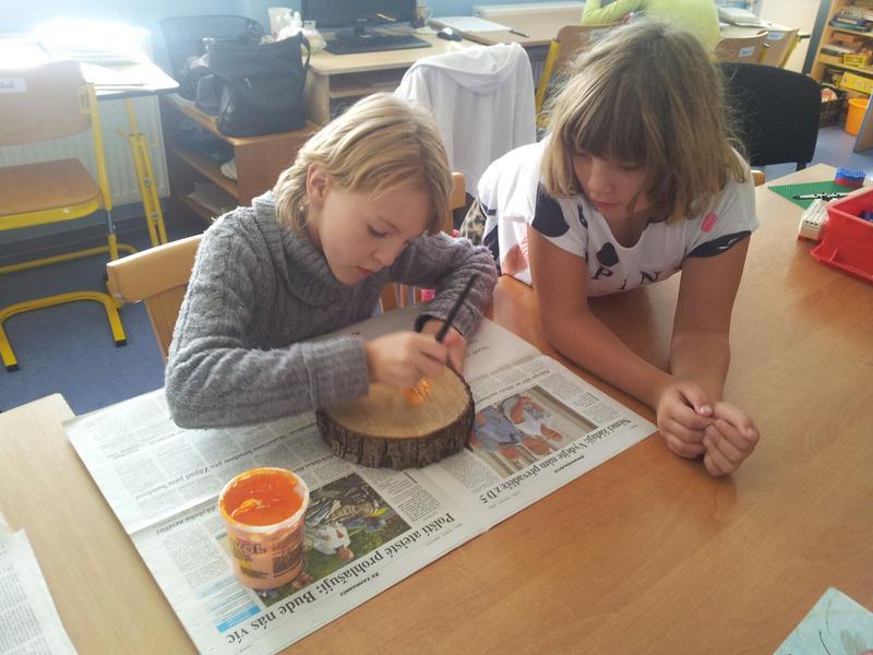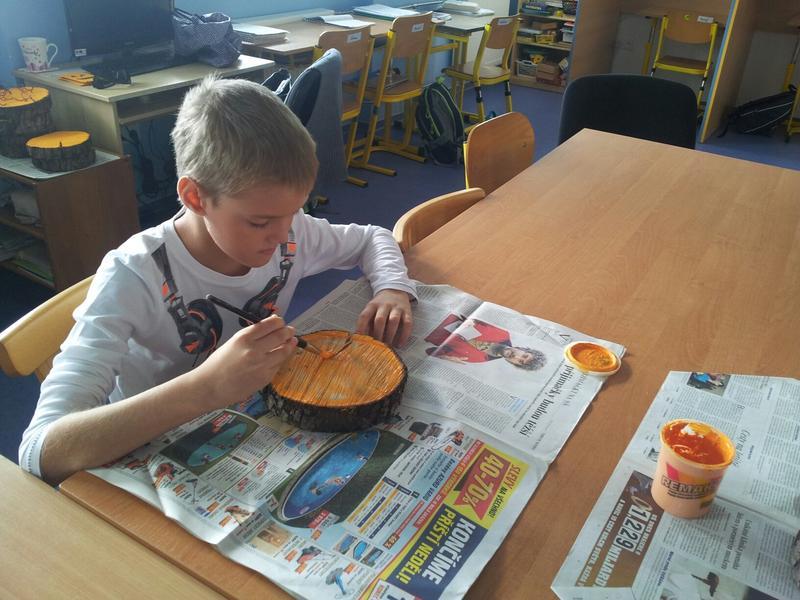 Dřevěné dýně nám zdobí školní prostory na schodišti, v šatně a taky ve třídě.