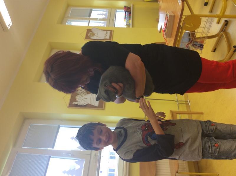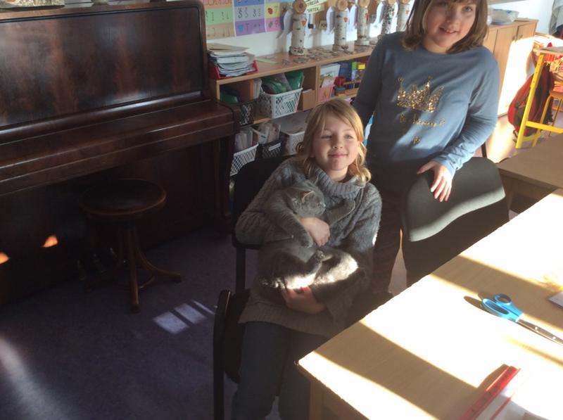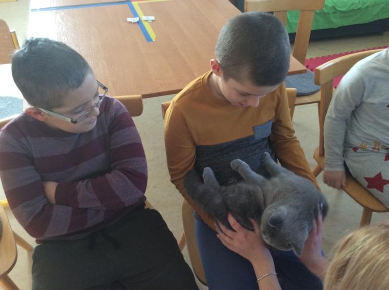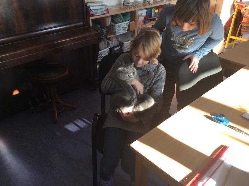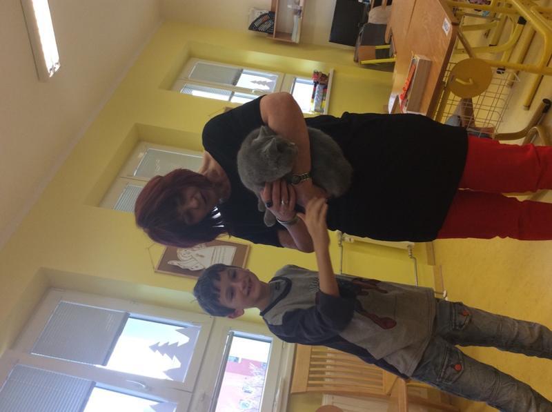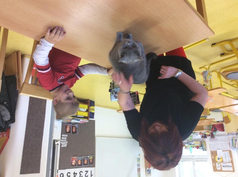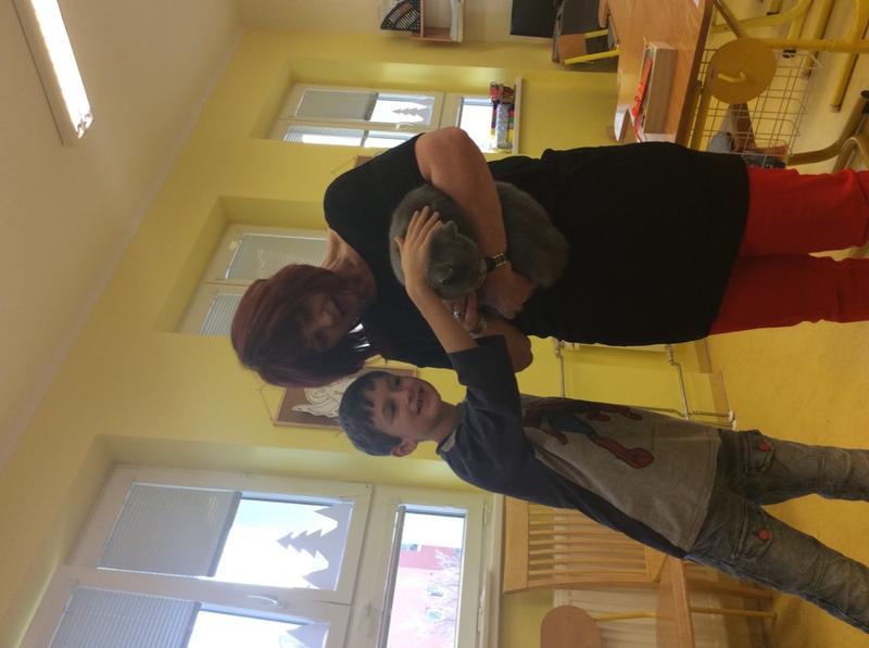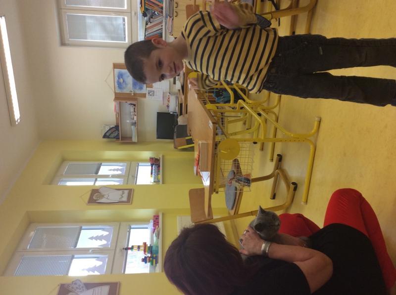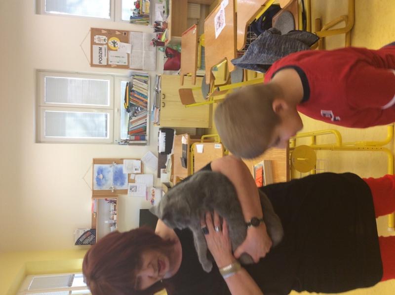 Kočka Ema opět zavítala do naší školy - tentokrát byla navštívit děti v horním patře. Některé ji pohladiy, od některých se nechala dokonce vzít do náruče.