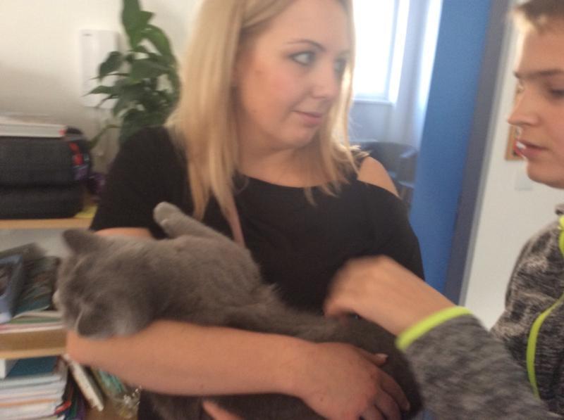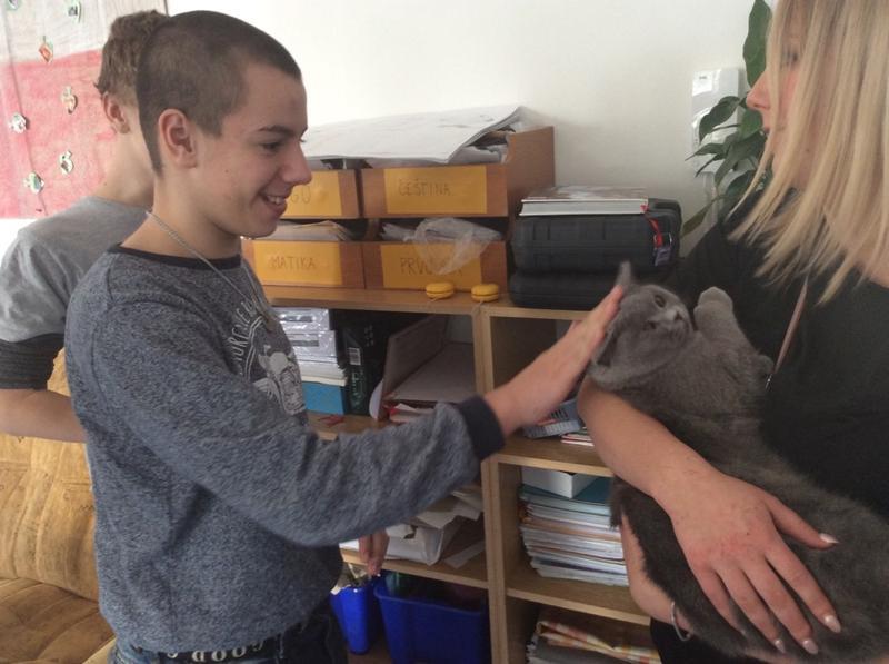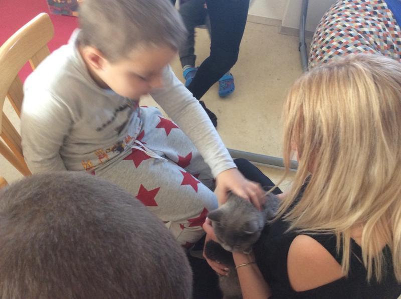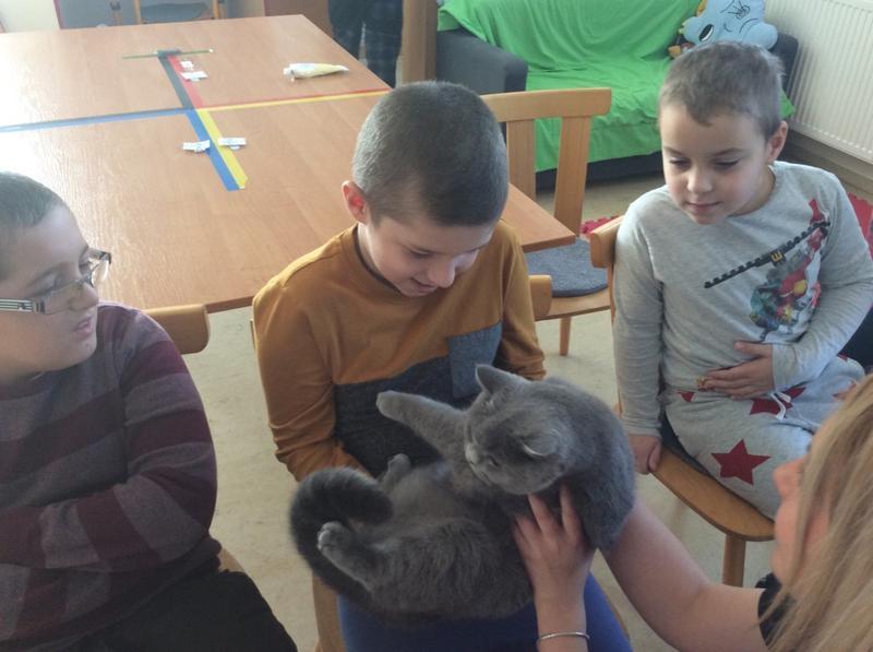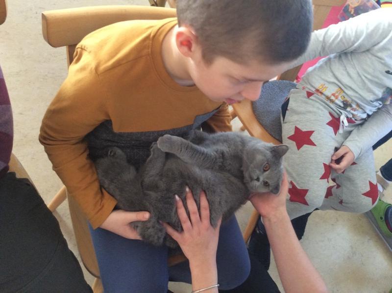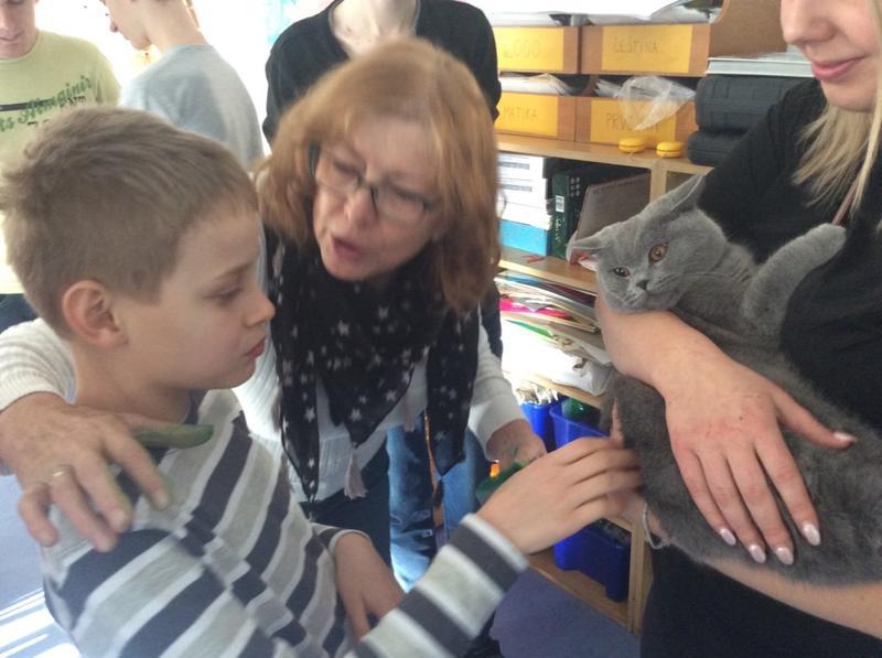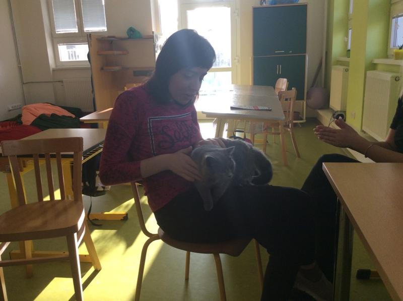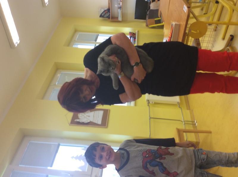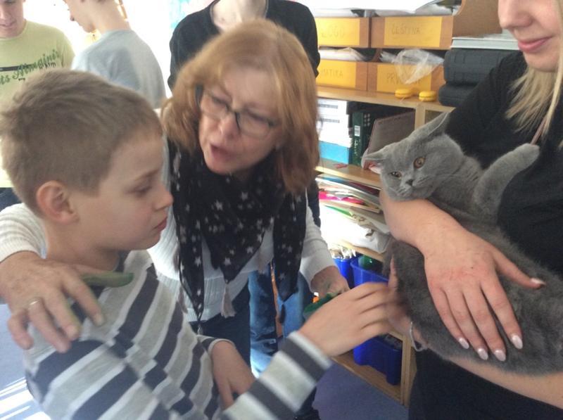 Kočka Ema opět zavítala do naší školy - tentokrát byla navštívit děti v horním patře. Některé ji pohladiy, od některých se nechala dokonce vzít do náruče.