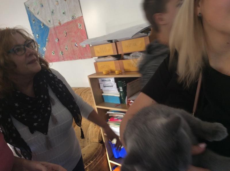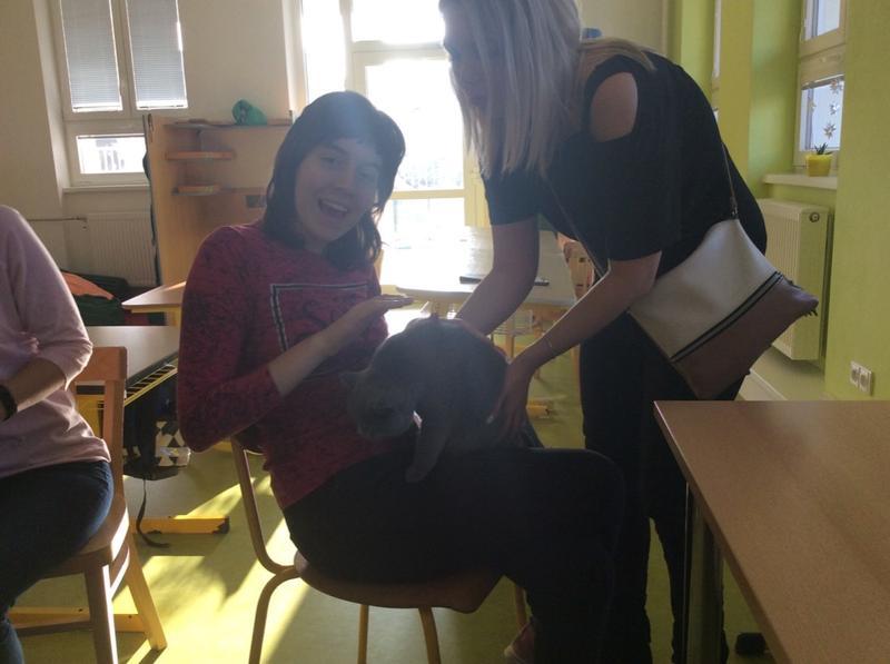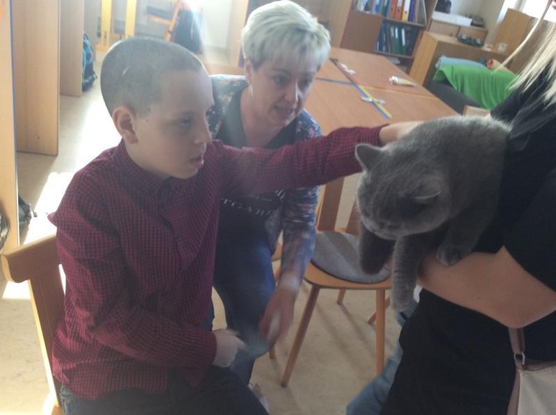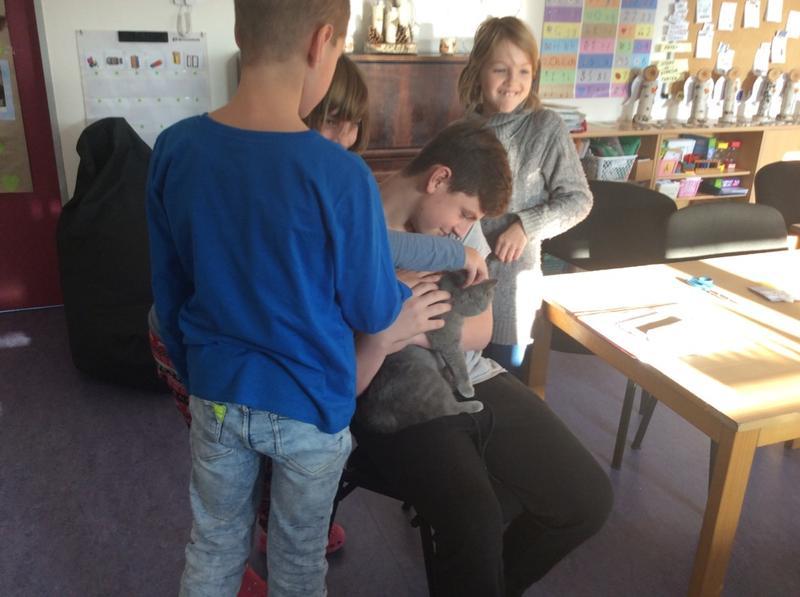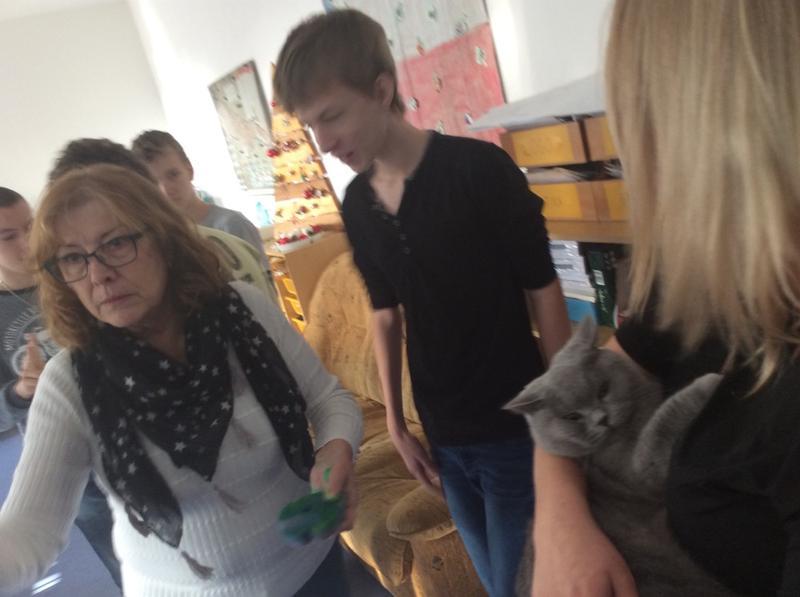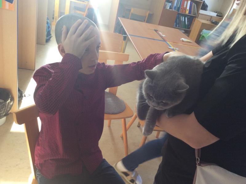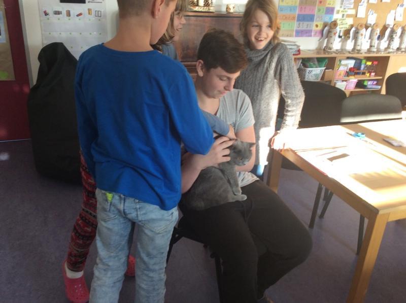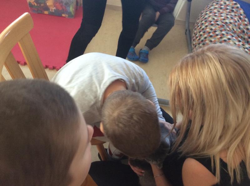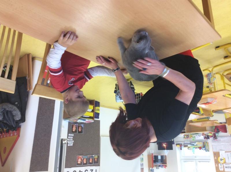 Kočka Ema opět zavítala do naší školy - tentokrát byla navštívit děti v horním patře. Některé ji pohladiy, od některých se nechala dokonce vzít do náruče.