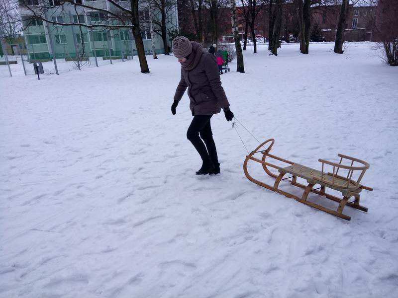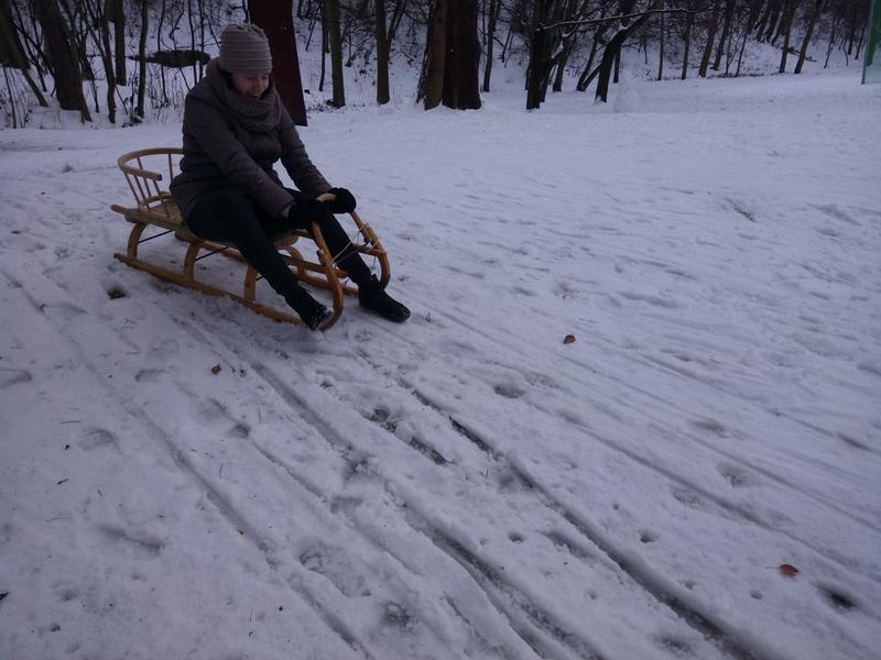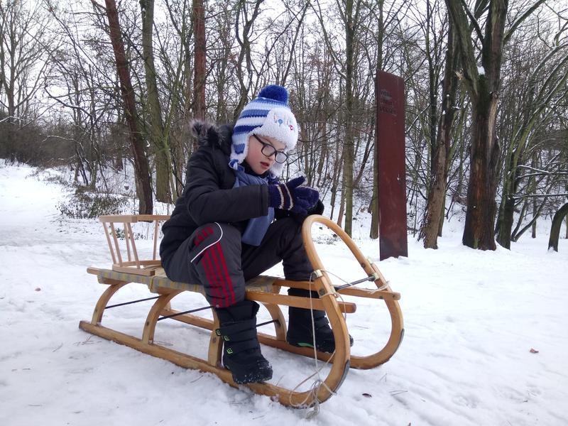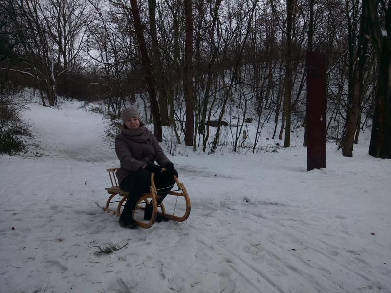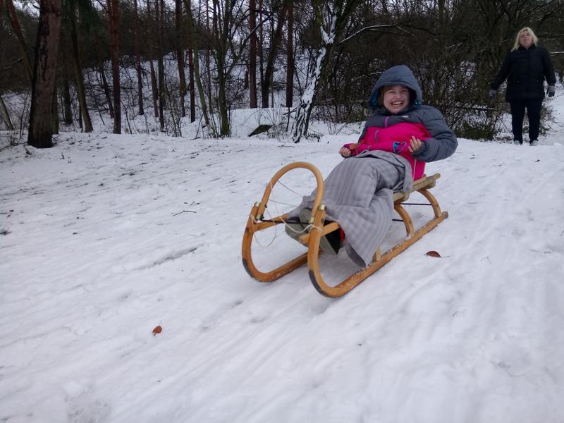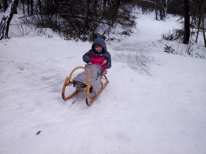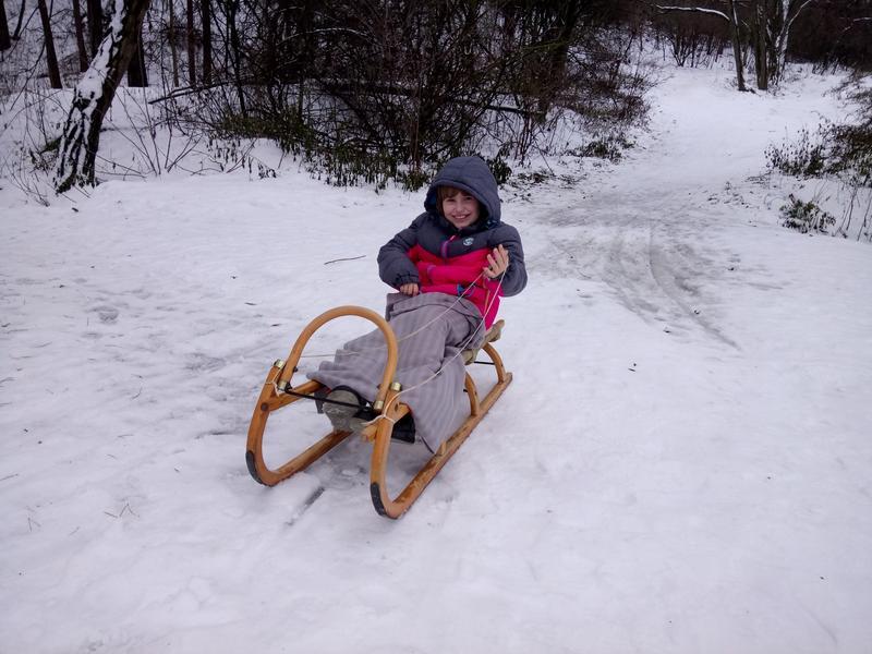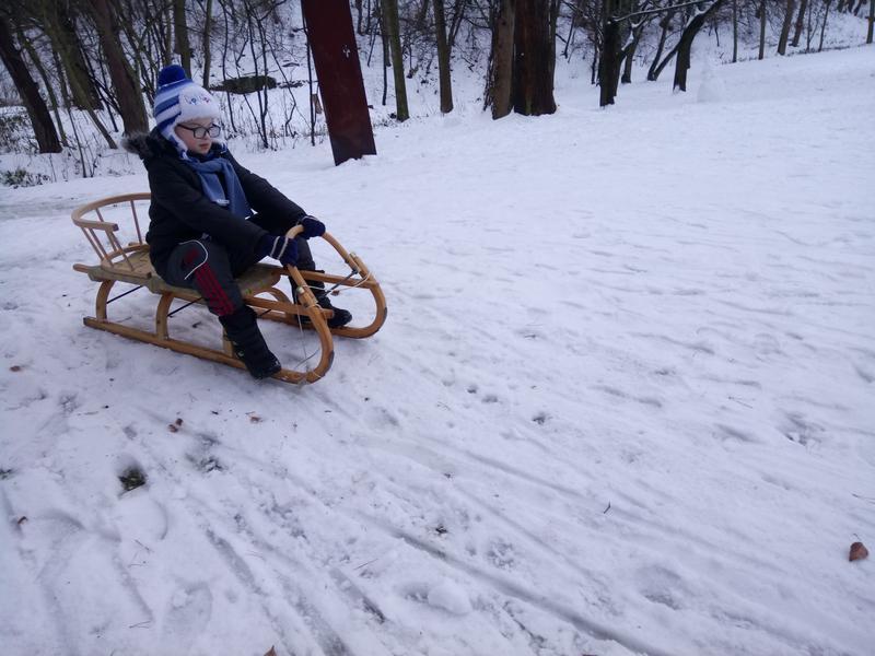 Abychom patřičně využili nadílku sněhu, oprášili jsme starší sáňky a hurá na kopec. Samozřejmě byl vybrán mírnější svah, tak abychom se nebáli a jízdu zvládli.