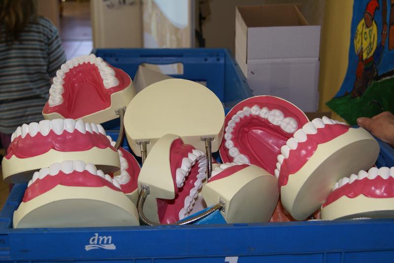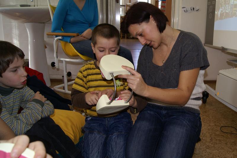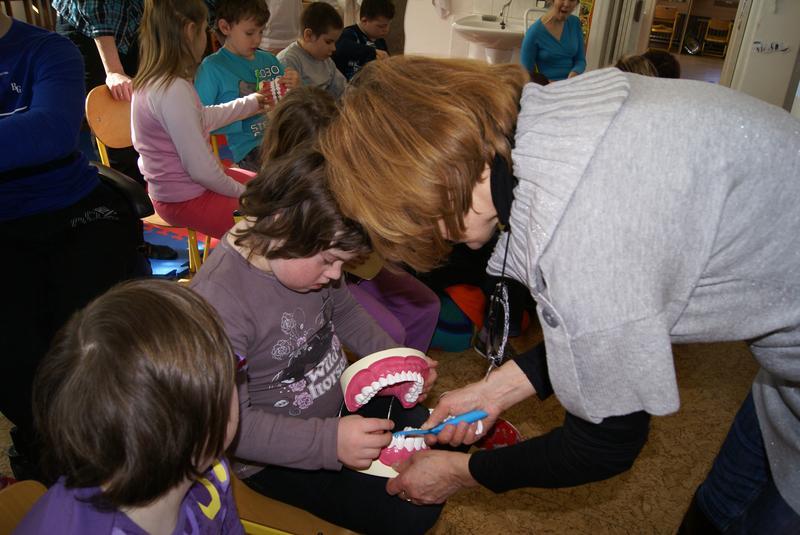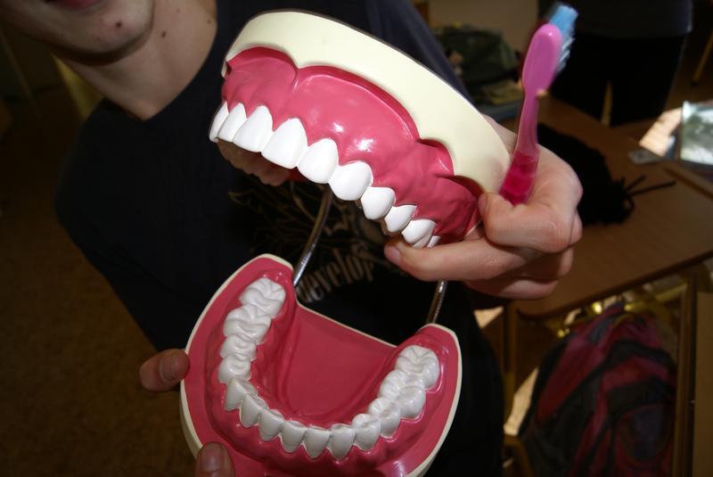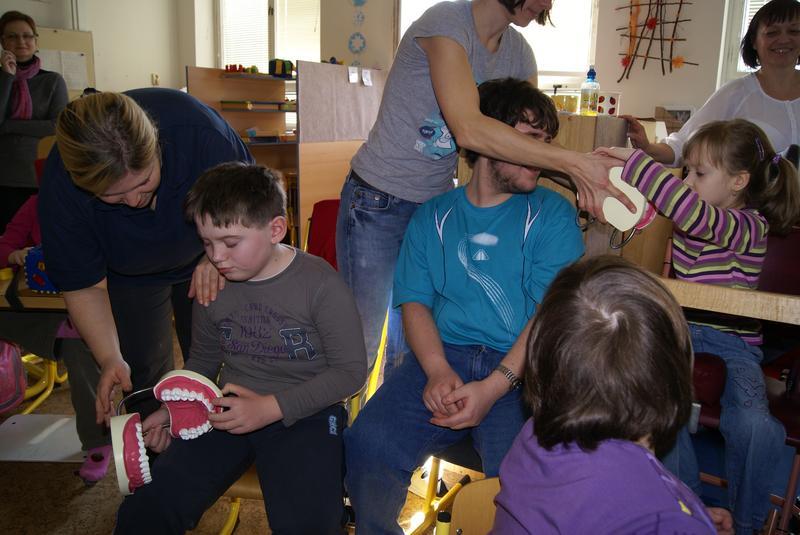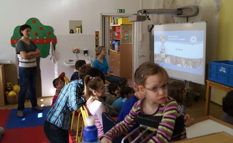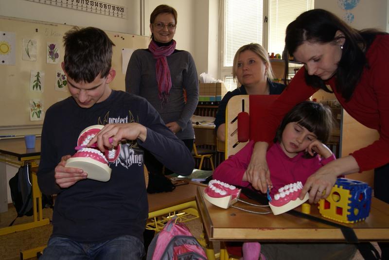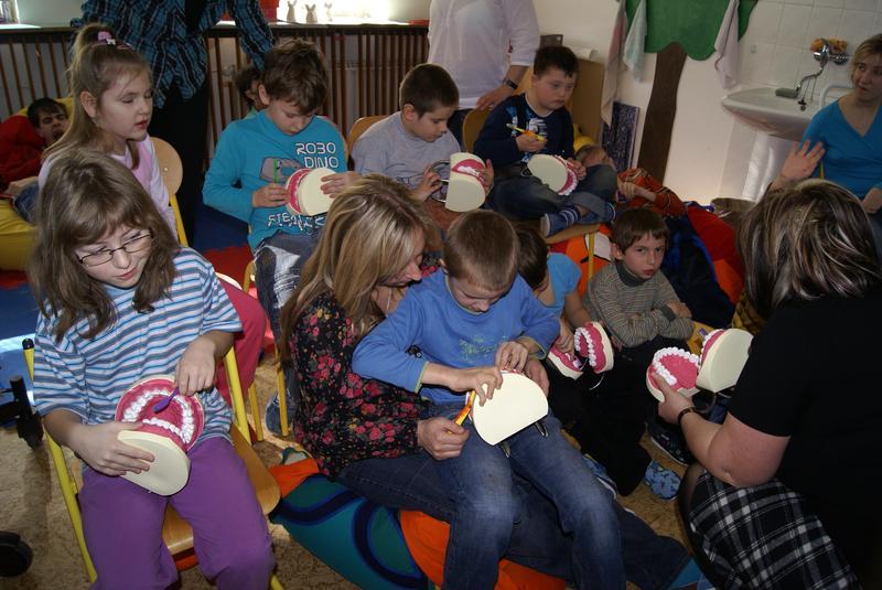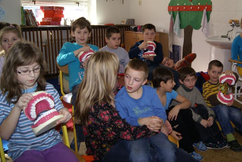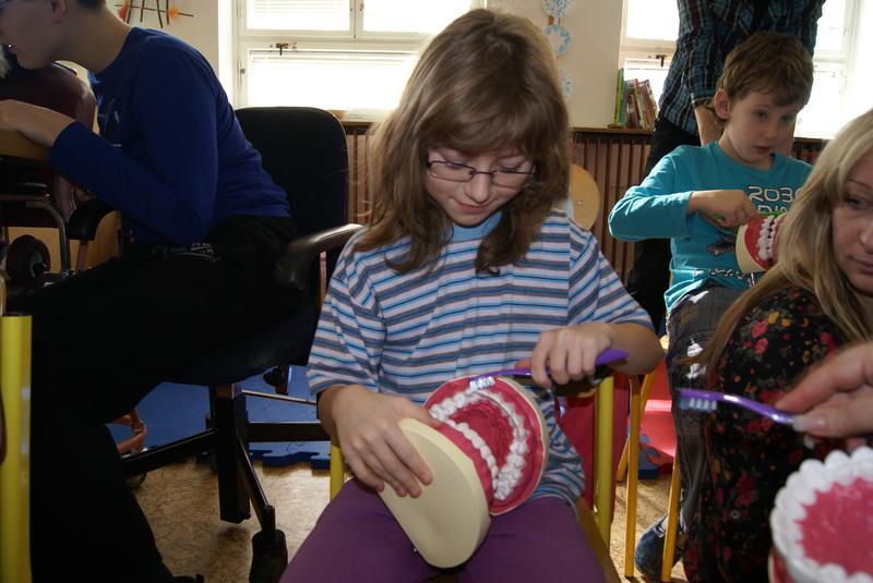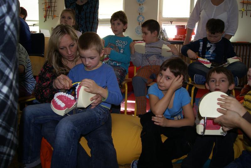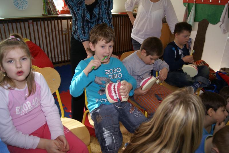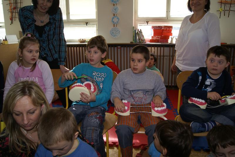 Dnes po svačince si mohli žáci naší školy, diky ochotným pracovnicím DM Drogerie, na zábavně obrovských modelech chrupu nacvičovat správný postup při čištění zubů. Doplněním slovních pokynů pak byl krátký film s názvem Veselé zoubky, kde celou procedůru čištění předvádí svým osobitým způsobem Mánička s Hurvínkem.