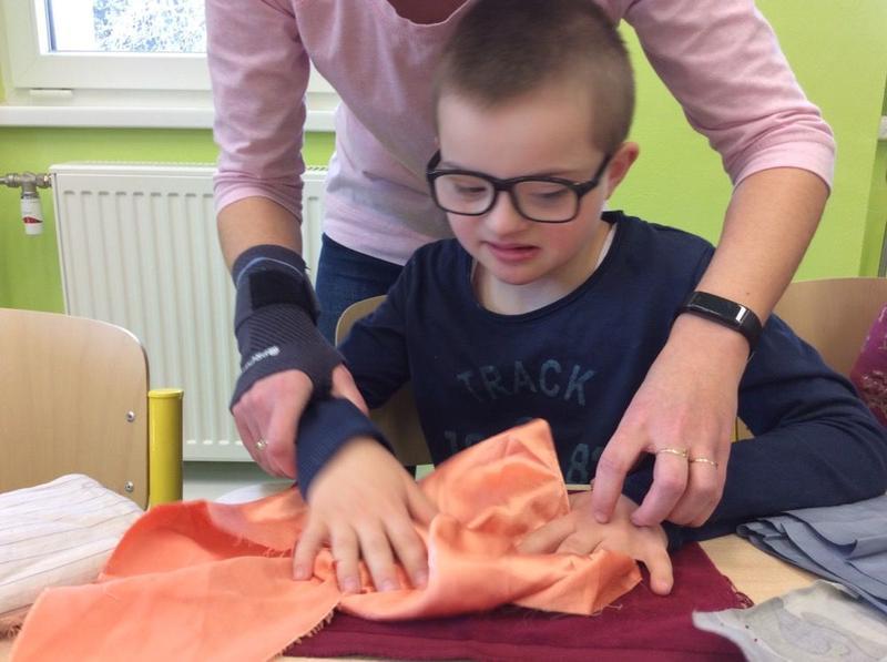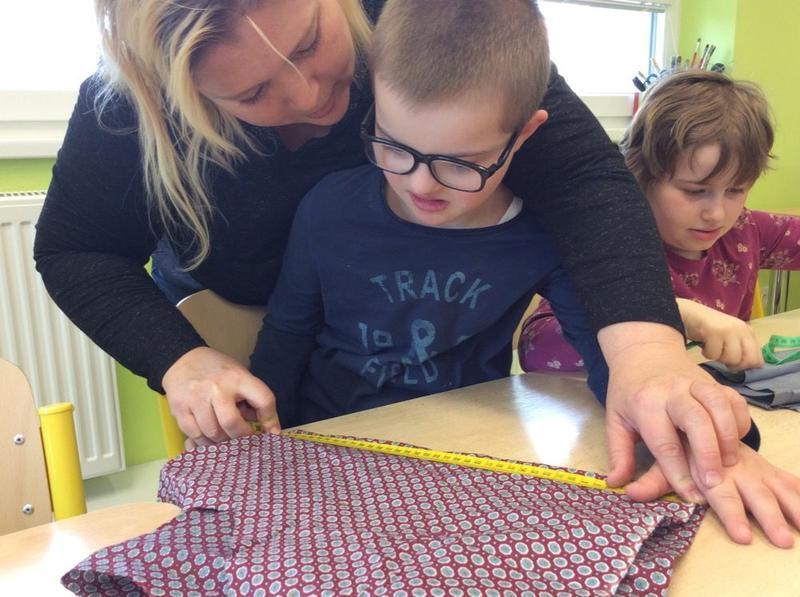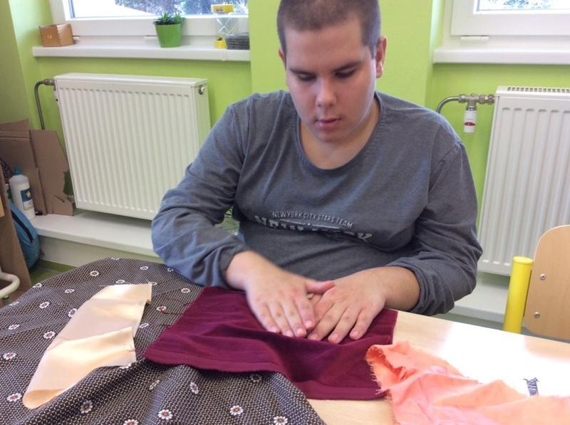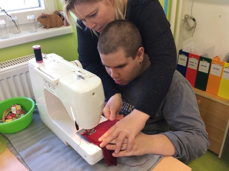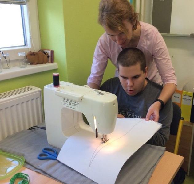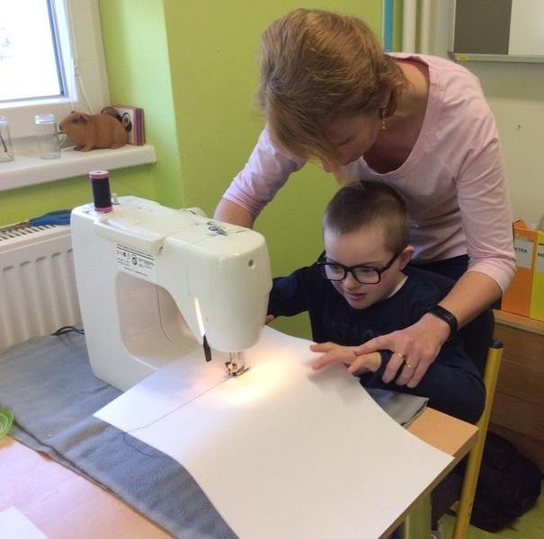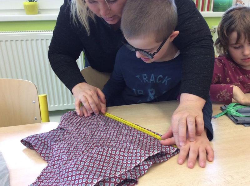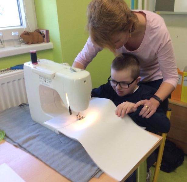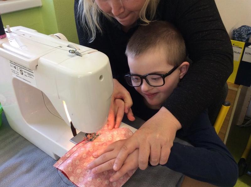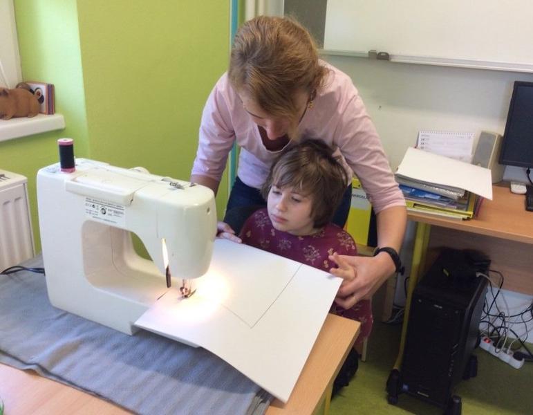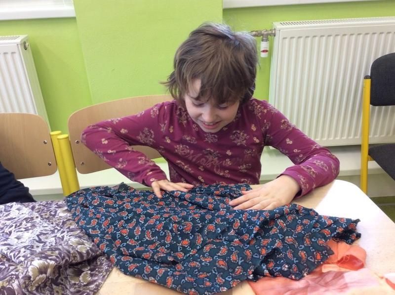 Tentokrát si ale děti mohly vyzkoušet něco nového - opravdový šicí stroj. S pomocí nejprve prošily papír, potom látku, vše si změřily, pokoušely se stříhat, poznávaly jednotlivé struktury. Všem se velmi dařilo.
