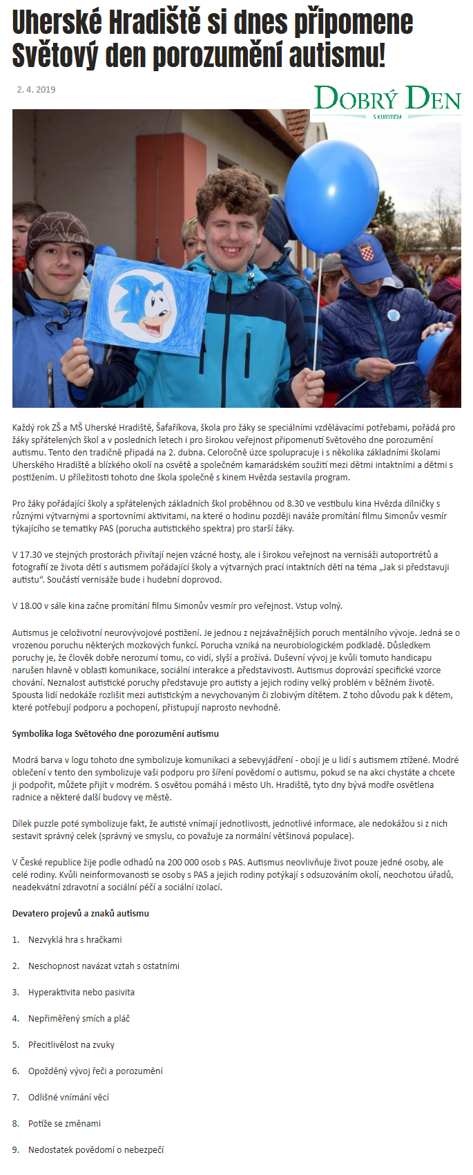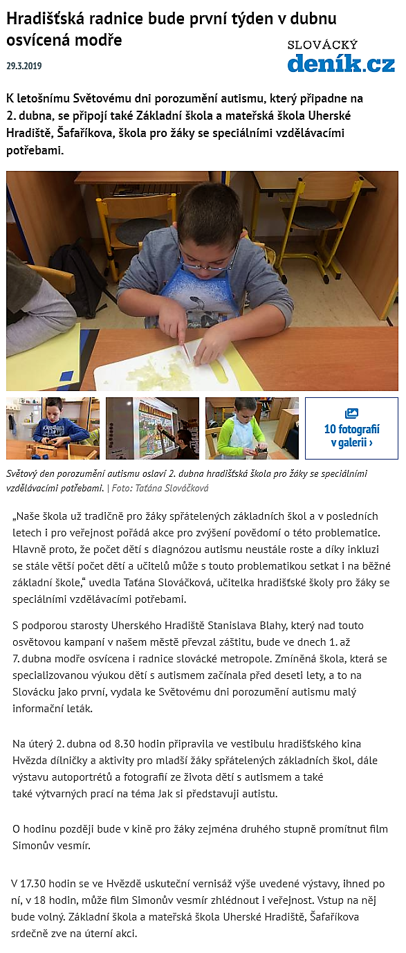 Akce se tradičně uskutečnila pod záštitou starosty města Uh. Hradiště pana Ing. Stanislava Blahy a po celý týden je modře osvícena i naše radnice.