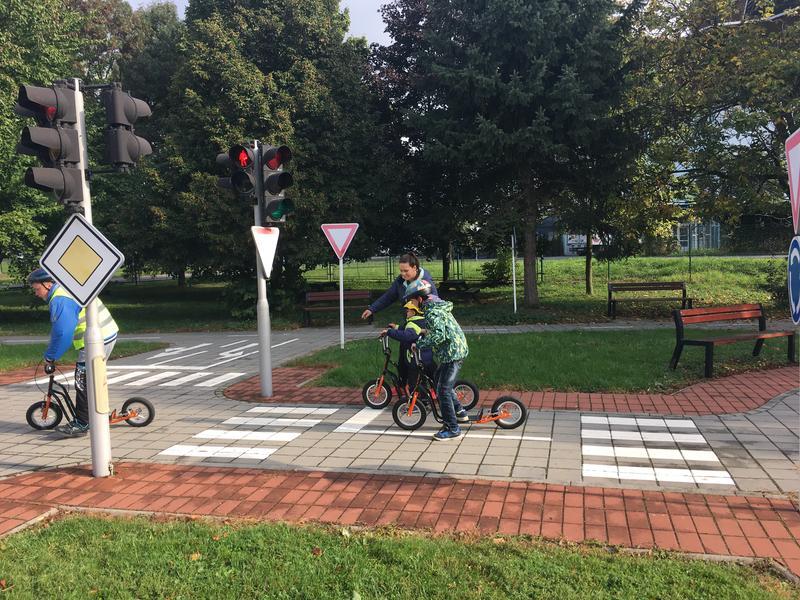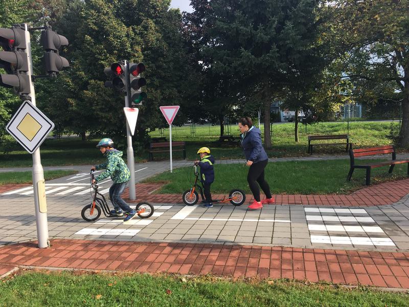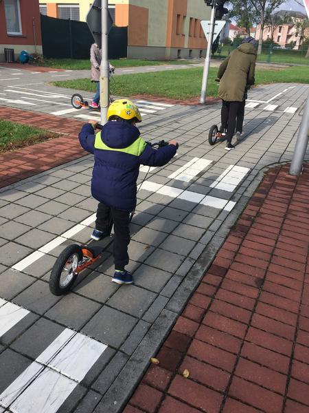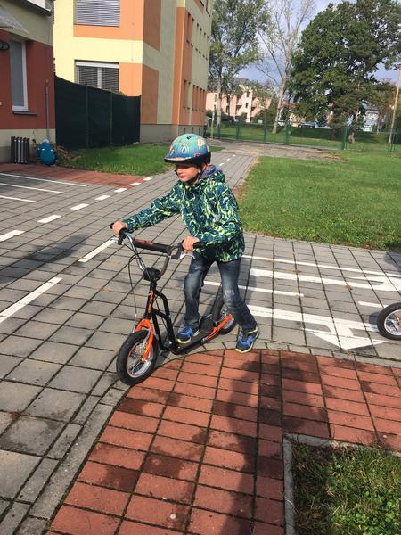 Opět jsme využili možnosti opakování i praktické výuky dopravních předpisů. Vyzkoušeli jsme si role chodců i řidičů, řádně se provětrali na koloběžkách a užili si možná jeden z posledních příjemně slunných podzimních dní.