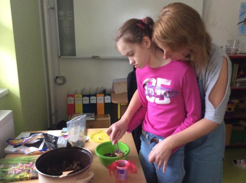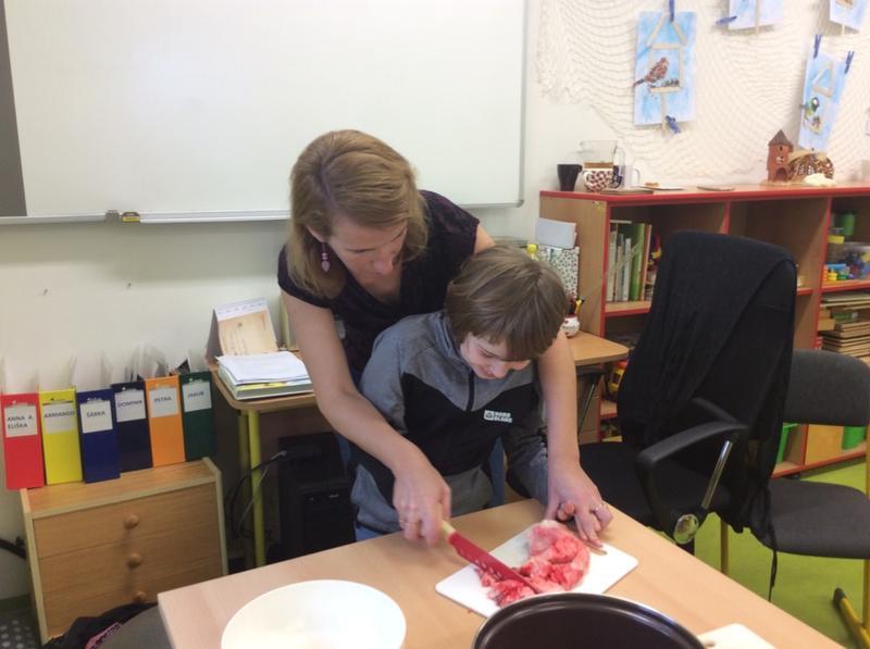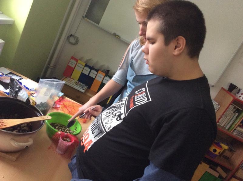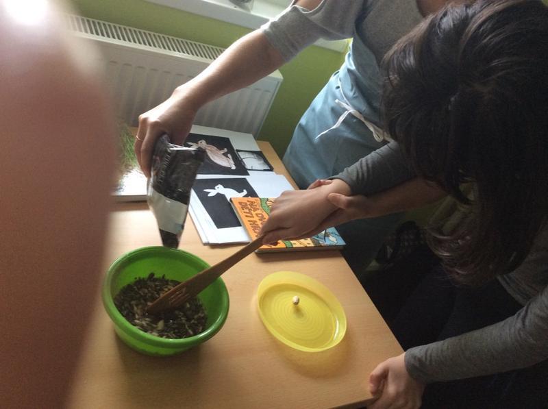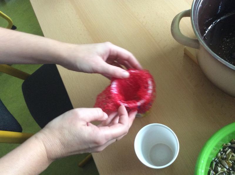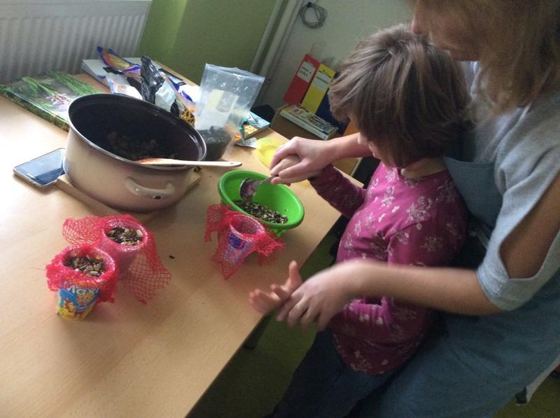 Přestože v letošním roce není silný mráz a prozatím ani nenapadl sníh, rozhodli jsme v pracovní výchově udělat ptáčkům malou dobrotu - lojové krmení. Základem byly námi vytvořené škvarky z hovězího loje a směs zrní.