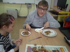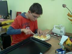 Jablečný koláč s drobenkou sice opravdu "drobil", ale to nám vůbec nevadilo :-). Do přípravy se zapojili všichni žáci a ještě nám zbyl čas na písničky a jablíčkách.