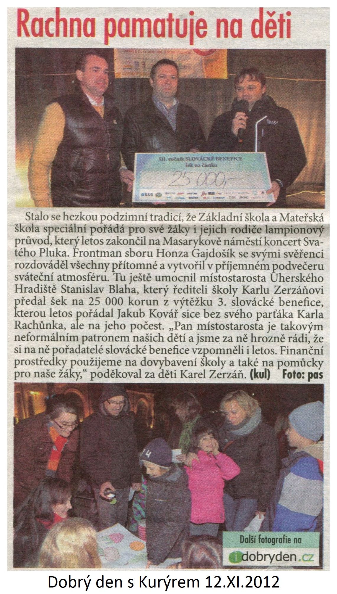 To největší radování přišlo na náměstí. Za velmi strhujícího zpěvu Sboru Svatého Pluku pod vedením dobře známého vedoucího pana Jana Gajdošíka, jsme začali nesměle tančit. Potom za přítomnosti pana místostarosty Ing. Stanislava Blahy dostala naše škola od pana Jakuba Kováře 25.000 Kč ze III. ročníku SLOVÁCKÉ BANEFICE (letos věnované památce Karla Rachůnka). Tyto peníze budou použity na chybějící rehabilitační a učební pomůcky pro žáky naší školy.