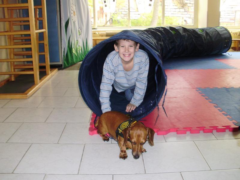 Hladili jsme, prolézali tunelem, česali, poznávali části těla, poznávali barvy misek na žrádlo, krmili, skládali pejska plyšového a dřevěného a v neposlední řadě se sem tam nechali i olíznout.