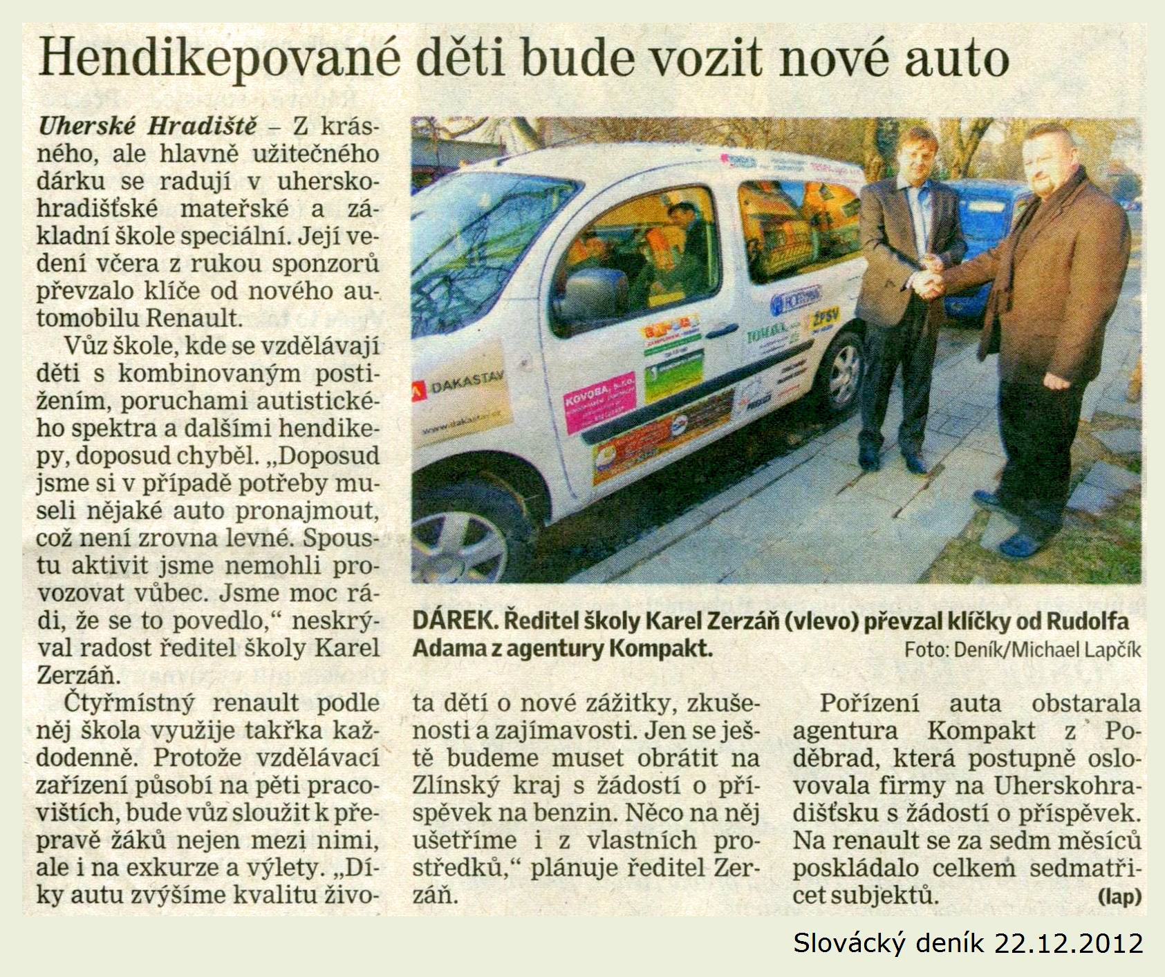 Krásný vánoční dárek obdrželi žáci naší školy. Díky reklamní agentuře Kompakt, s.r.o. a její obětavé obchodní zástupkyni paní Olze Pluhařové se podařilo od firem v našem regionu zíískat dostatek prostředků na nákup automobilu pro naši organizaci.