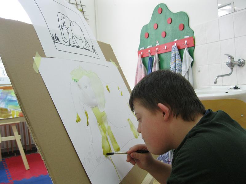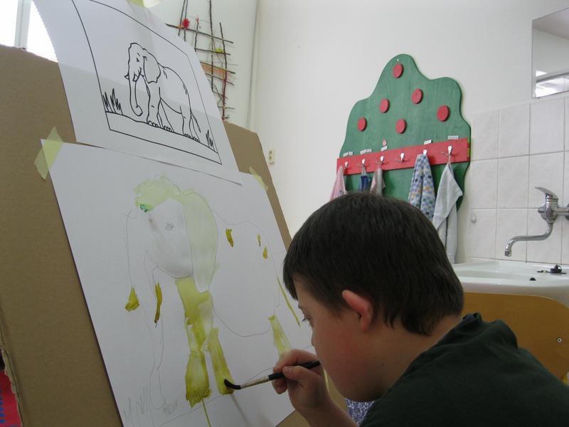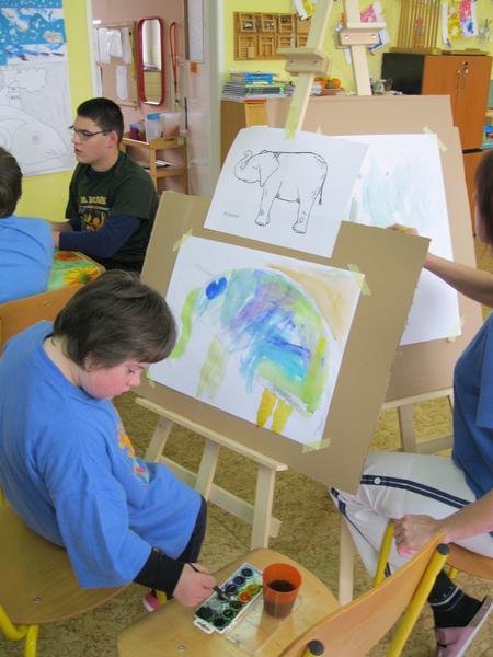 Jako skuteční malíři pracovali žáci výtvarného kroužku. Poprvé malovali u malířských stojanů. Každý měl svůj prostor, barvičky a obrázek slona, který zvětšil na formát A2 a vybarvil.